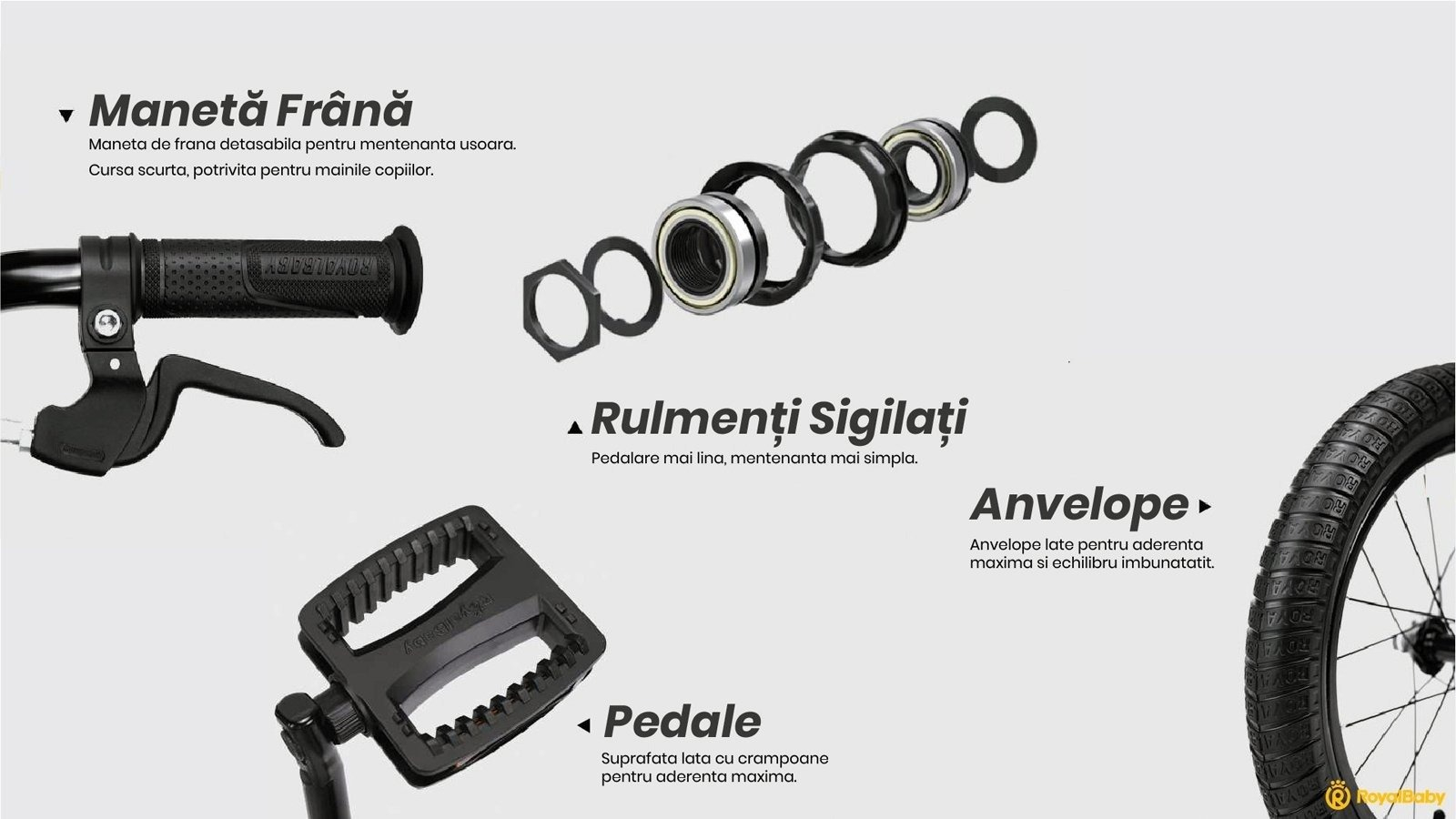 Siguranta este pe primul loc la RoyalBaby si caracterizeaza toate aspectele bicicletei, de la manetele de frana orientate catre copii cu o distanta scurta pentru maini mici, le anvelopele de dimensiuni mai mari decat cele standard pentru mai mult confort si stabilitate la rulare sau la reflectorizantele aprobate de legea germana sunt doar trei exemple care arata atentia pe care producatorul o acorda chiar si micilor detalii care ajung sa faca diferenta.
