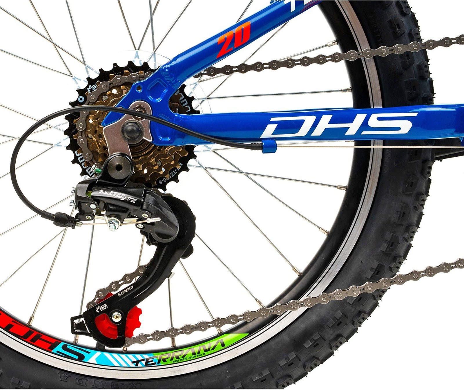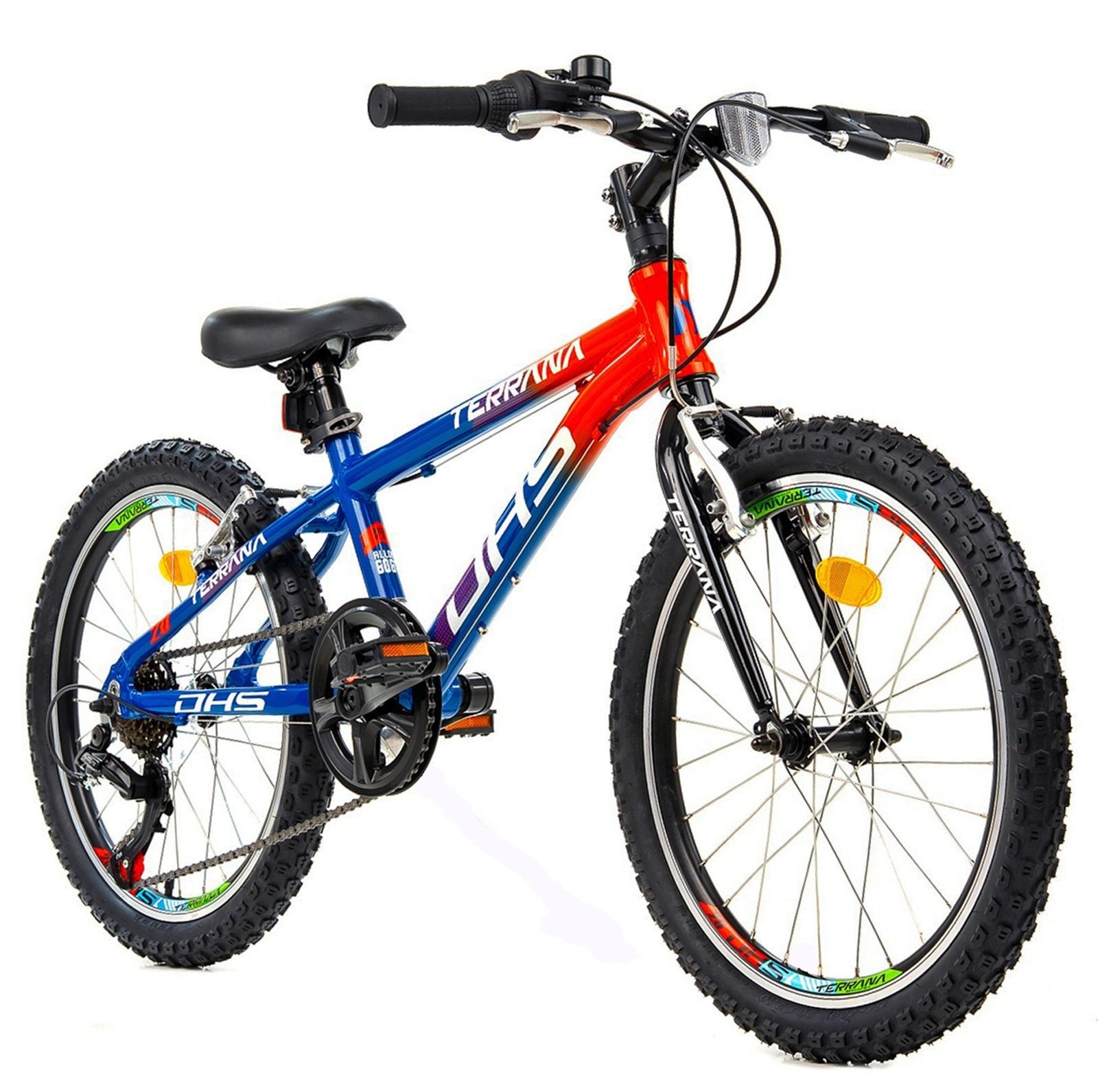 Bicicleta copii 20" DHS Terrana 2023, cadru aluminiu, manete RevoShift, frane V-Brake, 6 viteze, albastru/rosu, varsta 7-10 ani
