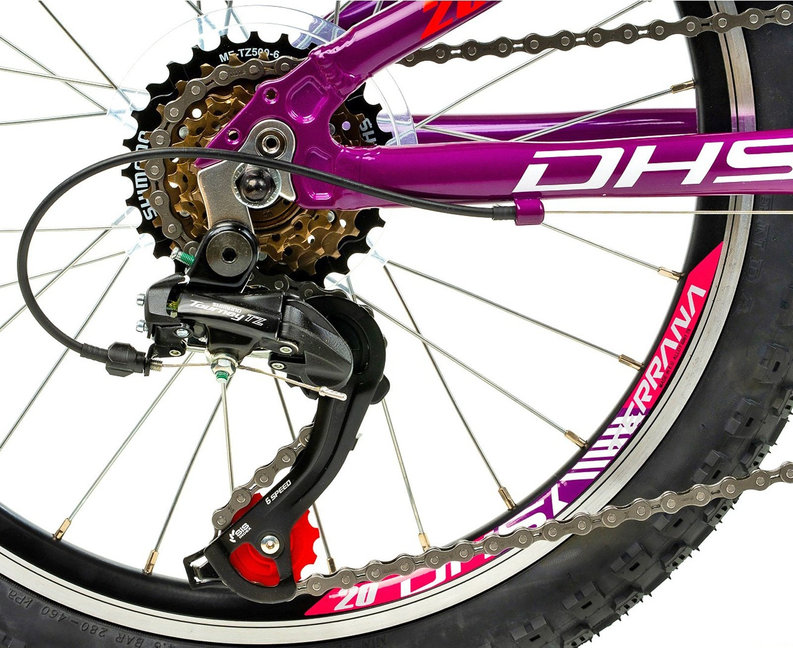 Bicicleta copii 20" DHS Terrana 2023, cadru aluminiu, manete RevoShift, frane V-Brake, 6 viteze, violet/roz, varsta 7-10 ani