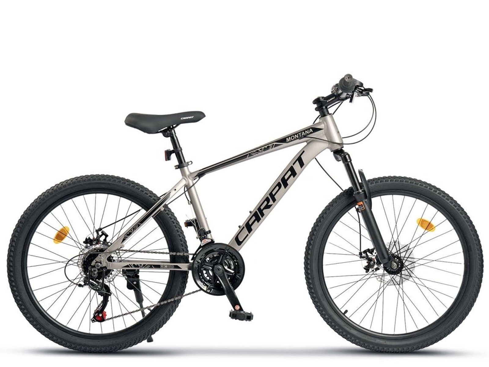 Bicicleta MTB-HT 24" CARPAT Montana, cadru aluminiu 14.5", manete RevoShift, frane disc, 21 viteze, gri/negru