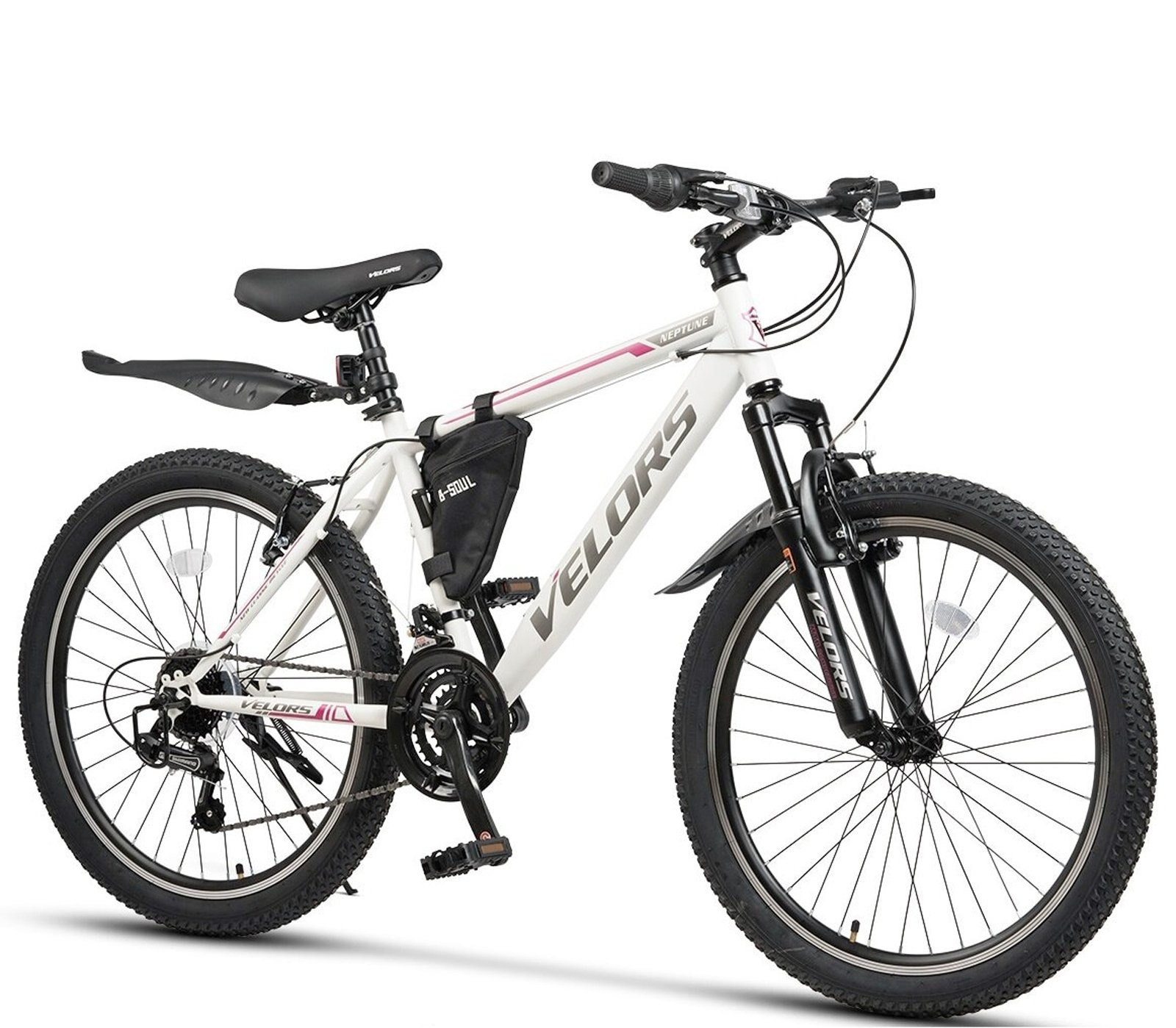Bicicleta MTB-HT 24" VELORS Neptune, cadru otel 17", manete RevoShift, frane V-Brake, 21 viteze, alb/roz