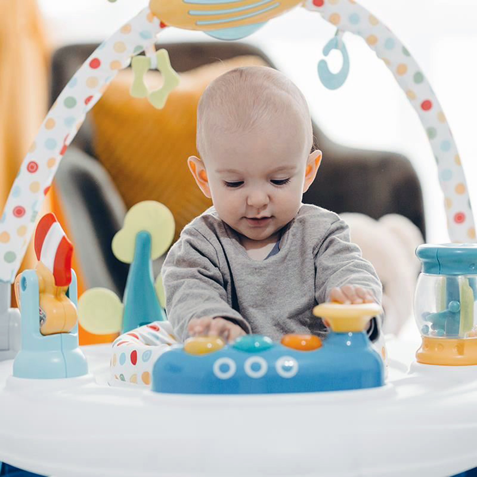 Bebelusul va fi distrat de o multitudine de jucarii muzicale, jucarii de plus si placa de la baza picioarelor care dezvolta inclinatia pentru activitati locomotorii. In plus, arcada cu jucarii senzoriale si de dentitie confera o extra garantie ca bebe nu se va plictisi atunci cand sta asezat in centrul de activitati. Disoponibil in trei culori vibrante si pozitive, Tasy-Go se transforma pe masura ce creste copilasul. Initial, produsul este un centru de activitati in care copilul se joaca cu jucariile din fata si spatele sau precum si cu cele de pe arcada. Ulterior, cand copilasul a inceput sa mearga si exerseaza primii pasi, el se va putea juca cu jucariile de pe produs stand in picioare langa el.
