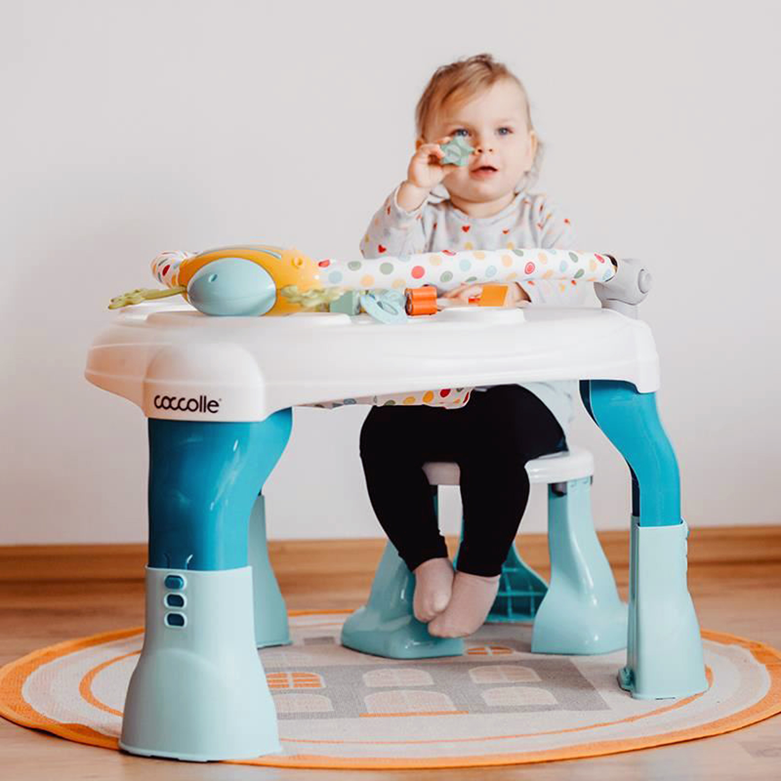 Multifunctional in adevaratul sensul al cuvantului, centrul de activitati Coccolle Tasy-Go este echipat cu un sezut care se roteste 360 grade si care ii garanteaza distractie continua celui mic: in momentul in care se plictiseste de jucariile din fata lui, se va putea roti catre cele din spatele sau. Arcada de jucarii este tematica si ii face cunostiinta copilului cu minunata lume a spatiului cosmic. Inaltimea centrului de activitati este ajustabila in 3 pozitii astfel ca micutului i se asigura o pozitie ergonomica si corespunzatoare pentru o dezvoltare sanatoasa. Odata ce copilul nu se mai joaca in centru, componentele acestuia se transforma, rapid si uimitor, intr-o masuta si scaunel, iar aventura continua in lumea cartilor de colorat, a blocurilor de desen si a plastelinei.