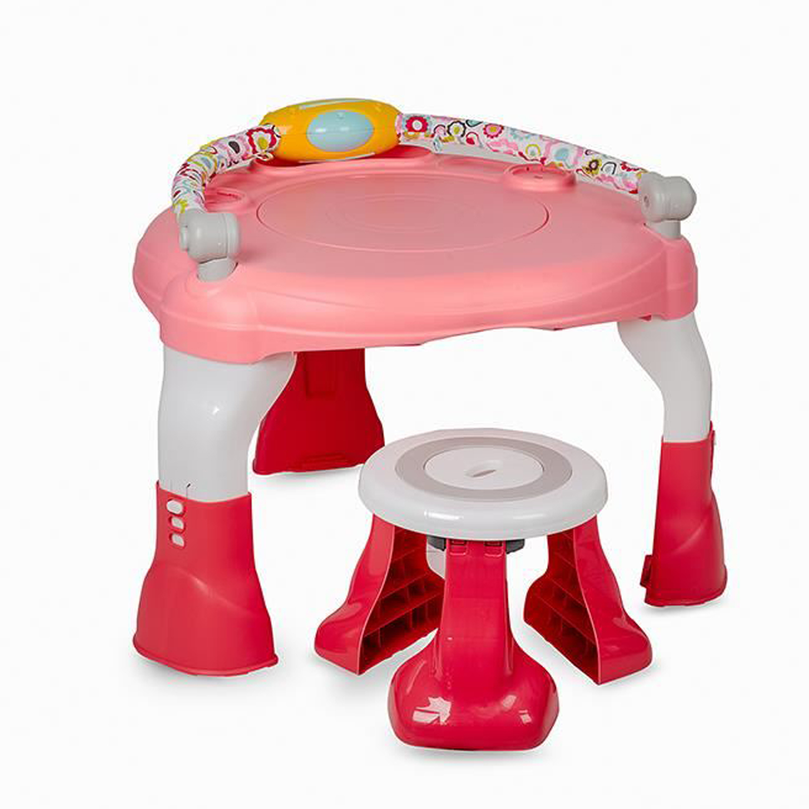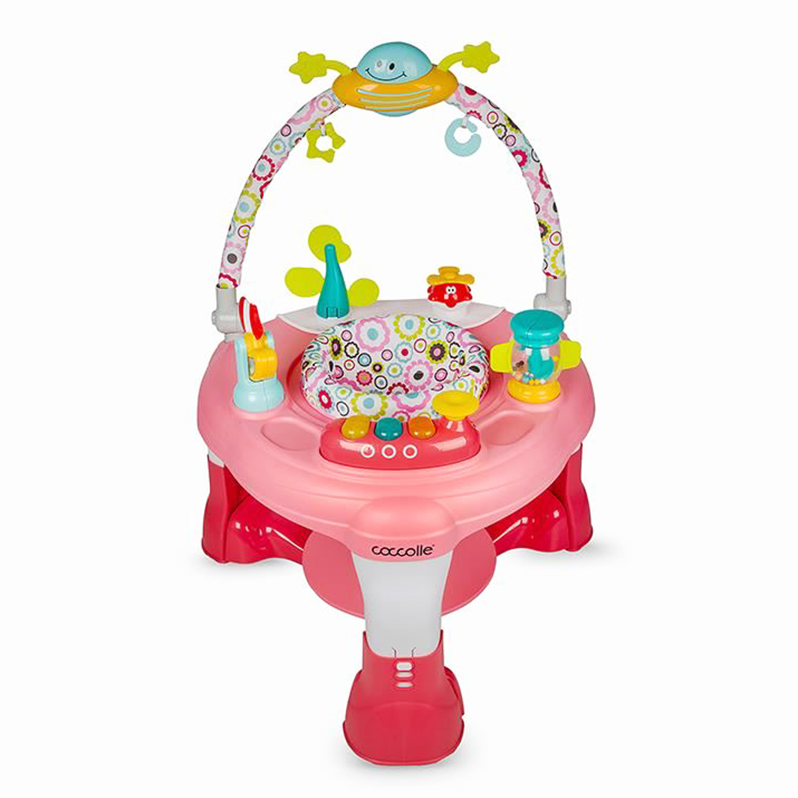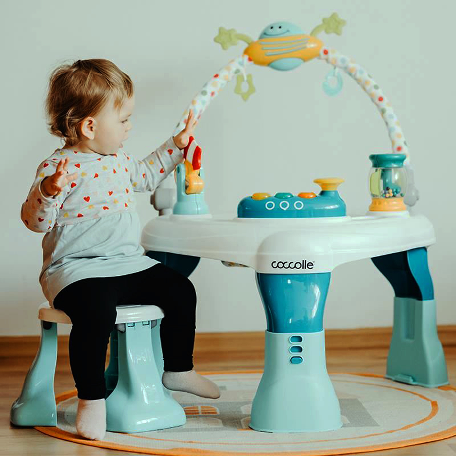Multifunctional in adevaratul sensul al cuvantului, centrul de activitati Coccolle Tasy-Go este echipat cu un sezut care se roteste 360 grade si care ii garanteaza distractie continua celui mic: in momentul in care se plictiseste de jucariile din fata lui, se va putea roti catre cele din spatele sau. Arcada de jucarii este tematica si ii face cunostiinta copilului cu minunata lume a spatiului cosmic. Inaltimea centrului de activitati este ajustabila in 3 pozitii astfel ca micutului i se asigura o pozitie ergonomica si corespunzatoare pentru o dezvoltare sanatoasa. Odata ce copilul nu se mai joaca in centru, componentele acestuia se transforma, rapid si uimitor, intr-o masuta si scaunel, iar aventura continua in lumea cartilor de colorat, a blocurilor de desen si a plastelinei.