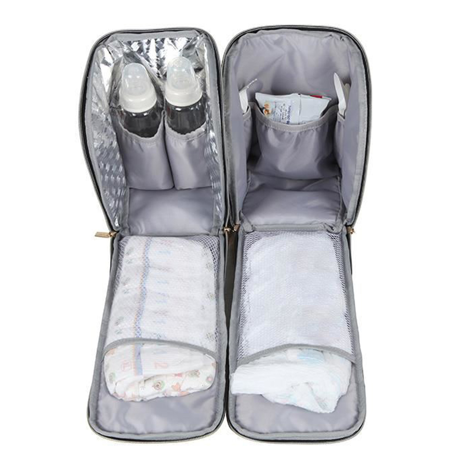 - In interior, contine un buzunar special pentru salteluta de infasat; un buzunar cu fermoar pentru obiectele importante; 2 buzunare transparente pentru elementele umede;