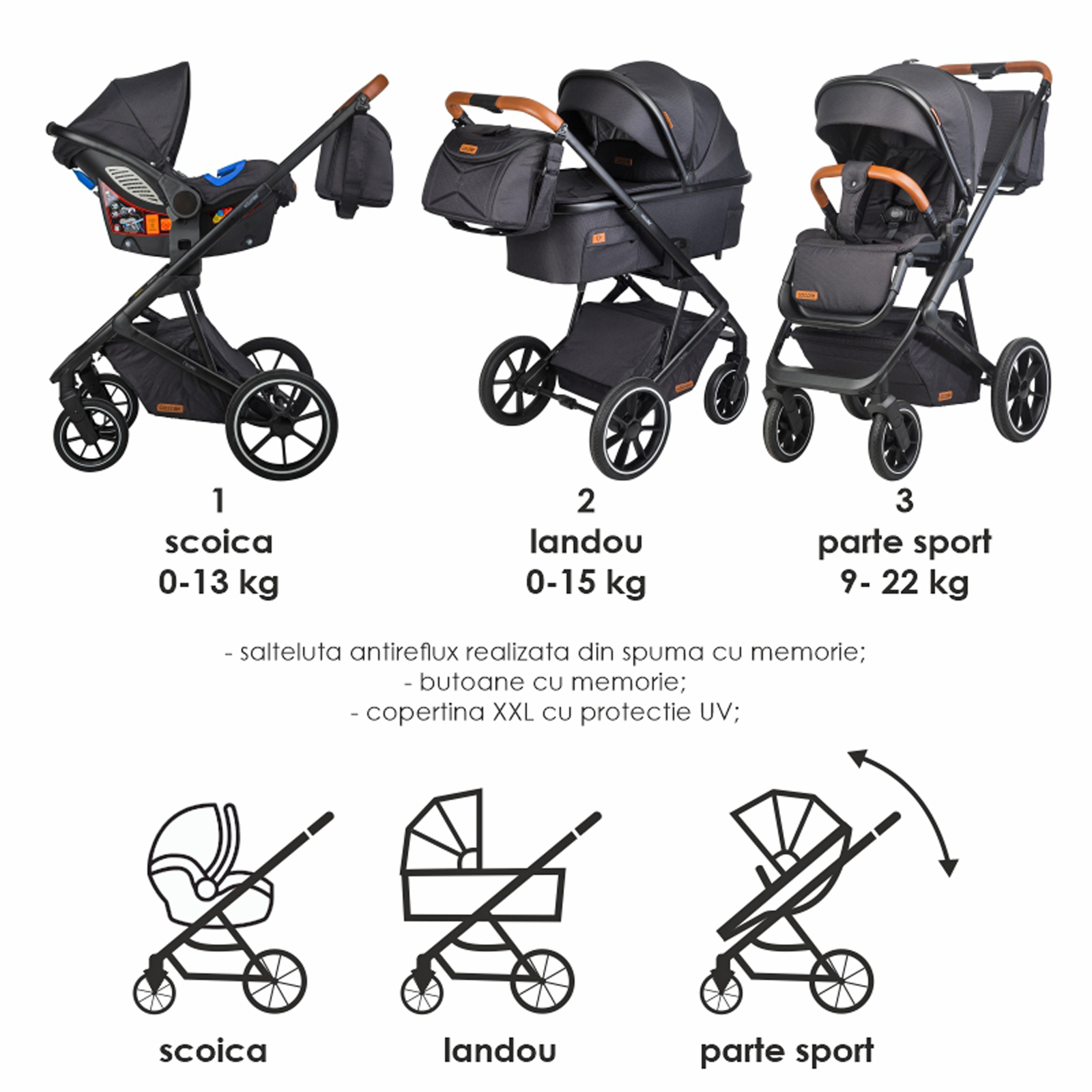 - Landou cu salteluta cu spuma de memorie si interior tratat anti-bacterian cu ioni de argint, copertina XXL cu fereastra de ventilatie.