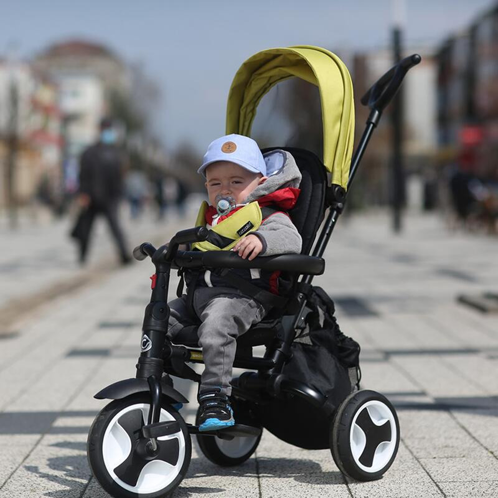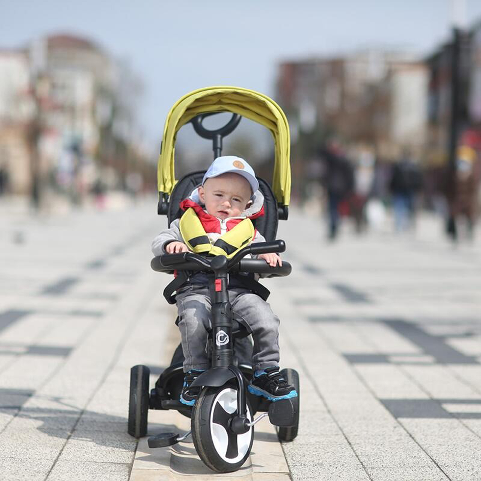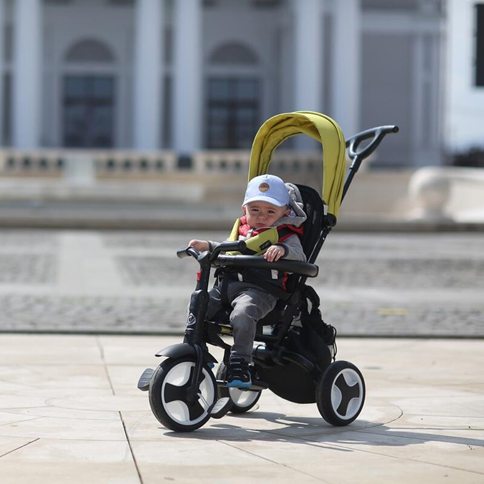 Pentru a spori confortul copilasilor, dar a si prelungi timpul petrecut afara, tricicleta este conceputa pentru a oferi o pozitie comoda de somn atat pentru utilizarea cu fata la sensul de mers, cat si cu spatele intrucat ghidonul se pliaza si confera inca un grad de inclinare spatarului. Dotata cu centura de siguranta in 5 puncte, produsul ofera siguranta necesara in oricare stadiu al utilizarii acestuia.