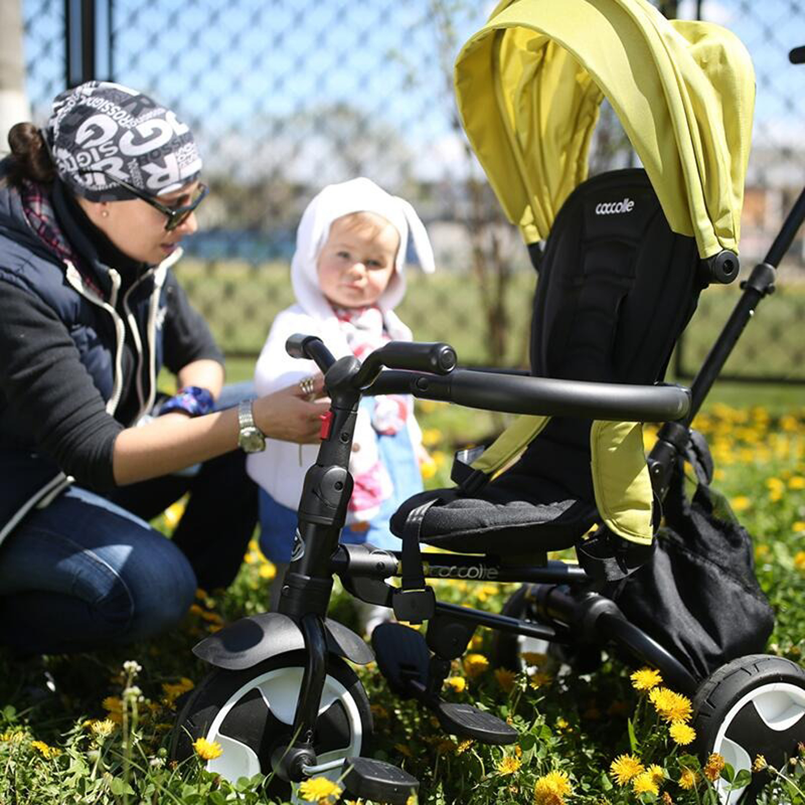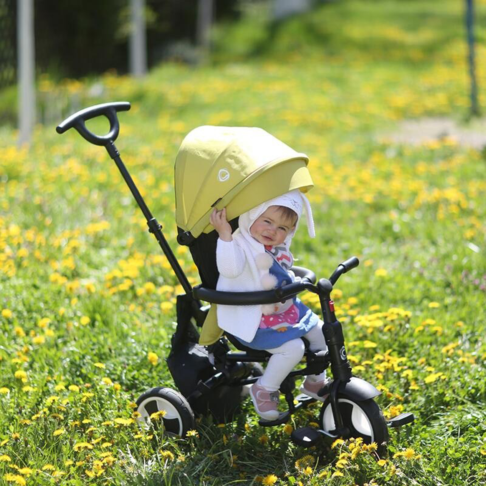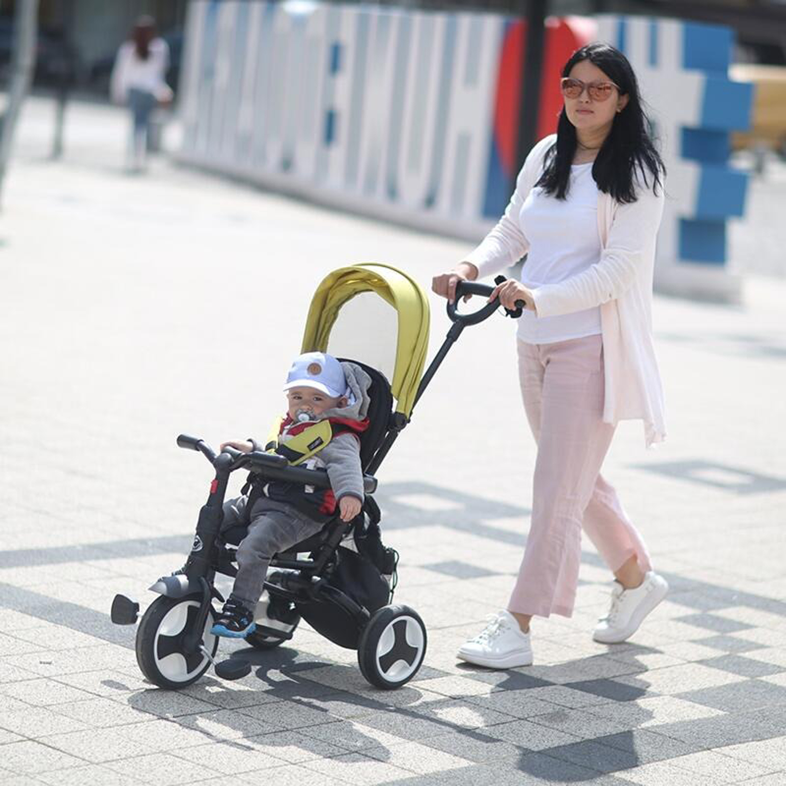 Pentru a spori confortul copilasilor, dar a si prelungi timpul petrecut afara, tricicleta este conceputa pentru a oferi o pozitie comoda de somn atat pentru utilizarea cu fata la sensul de mers, cat si cu spatele intrucat ghidonul se pliaza si confera inca un grad de inclinare spatarului. Dotata cu centura de siguranta in 5 puncte, produsul ofera siguranta necesara in oricare stadiu al utilizarii acestuia.