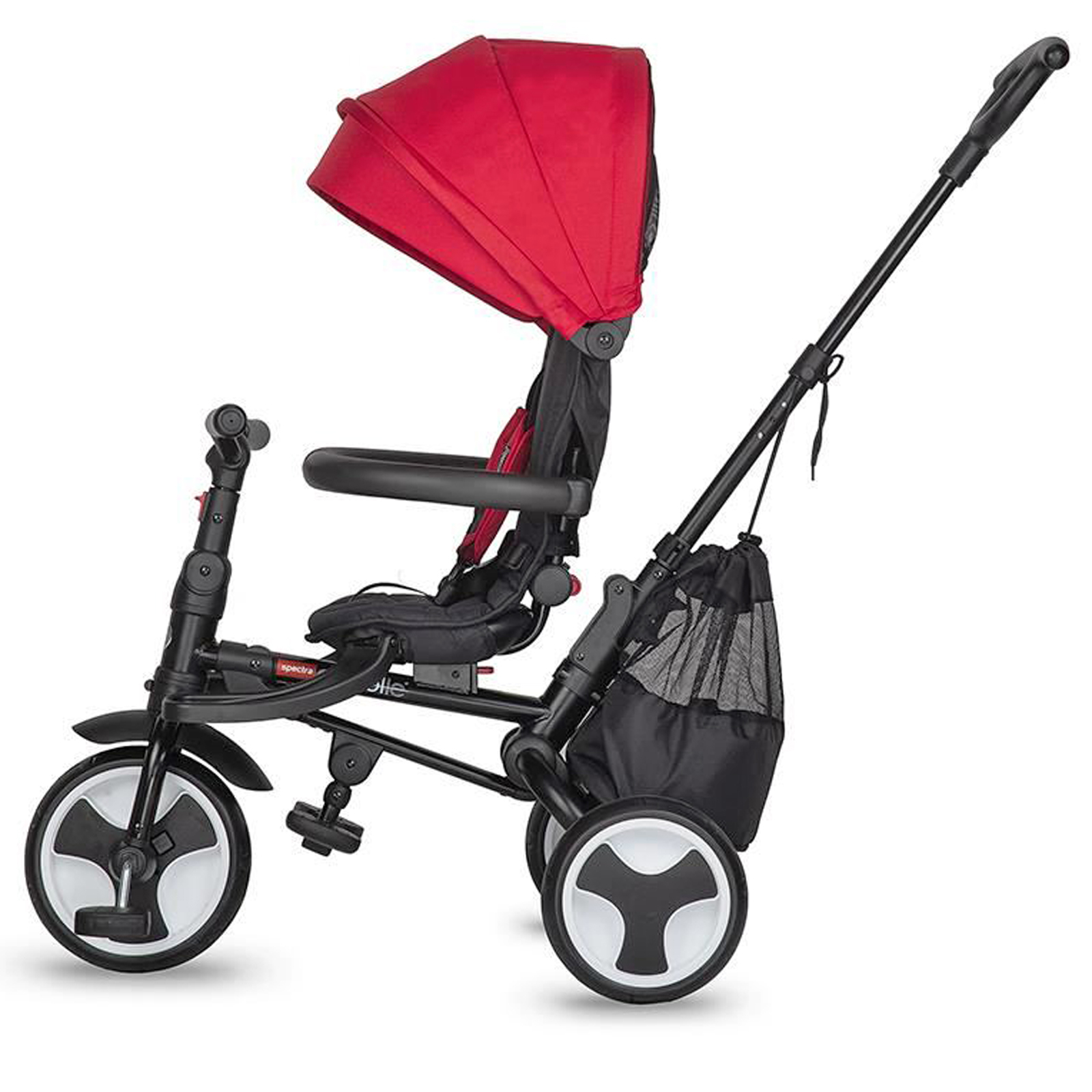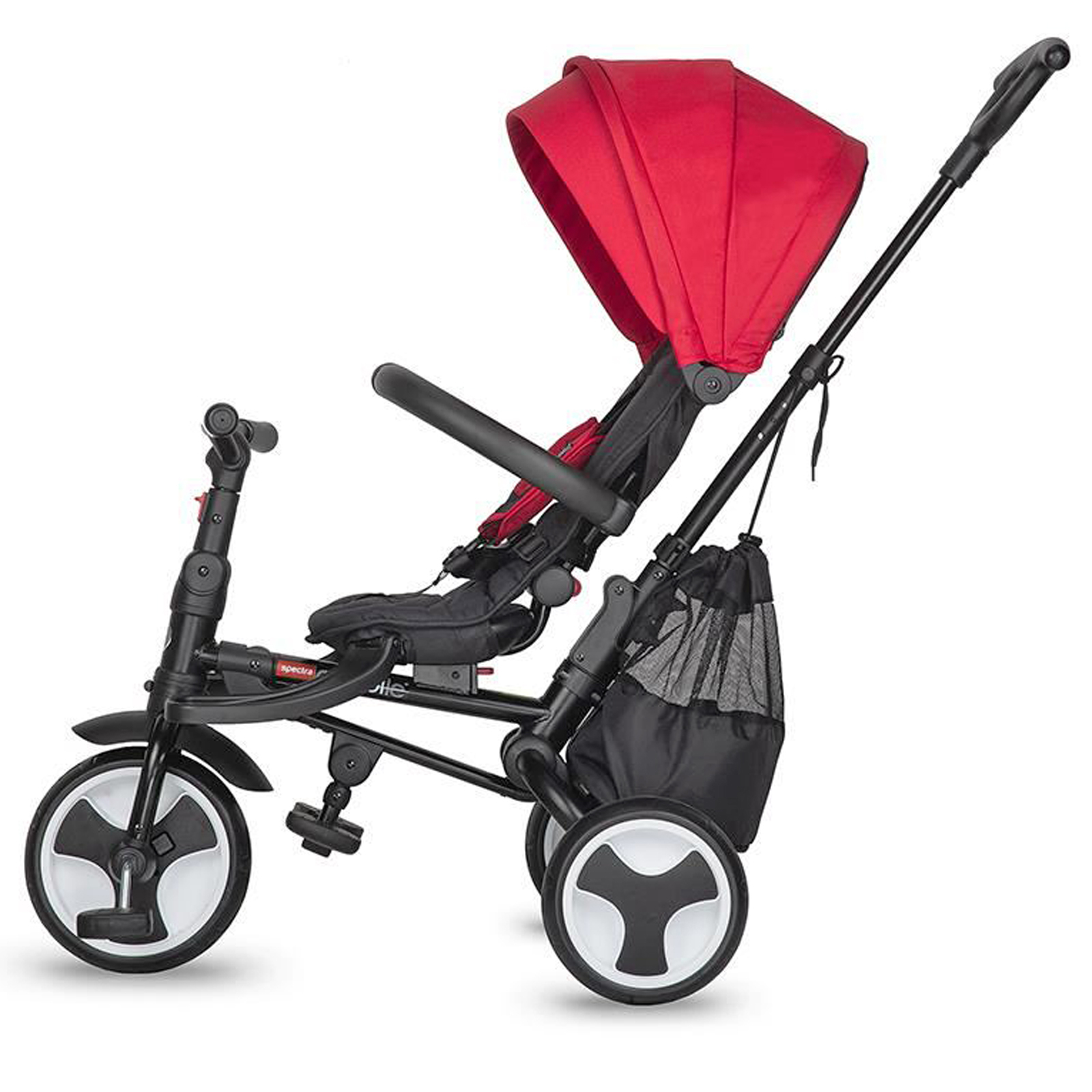 Usor de asamblat, tricicleta Spectra nu da batai de cap parintilor si promoveaza un stil de viata activ, la aer liber. Gratie sistemului de pliere usor de utilizat, produsul poate fi luat oriunde intrucat incape in cele mai mici spatii de depozitare si in portbagajul oricarei masini. Copertina tricicletei ofera protectie UV, astfel ca o puteti utiliza chiar in cele mai toride locatii. Functia de roata libera permite blocarea rotii astfel inca chiar daca micutul pedaleaza roata fata nu se va invarti, deci utilizarea produsului de catre copiii mai mici nu constituie o problema. Pentru confortul parintilor, tija auxiliara este telescopica, iar frana dubla localizata la nivelul rotilor din spate confera extra stabilitate in momentul stationarii.Pe masura ce creste, toate elementele tricicletei se detaseaza astfel ca, in cele din urma, produsul va putea fi utilizat ca o tricicleta clasica cu sezut, ghidon si pedale.