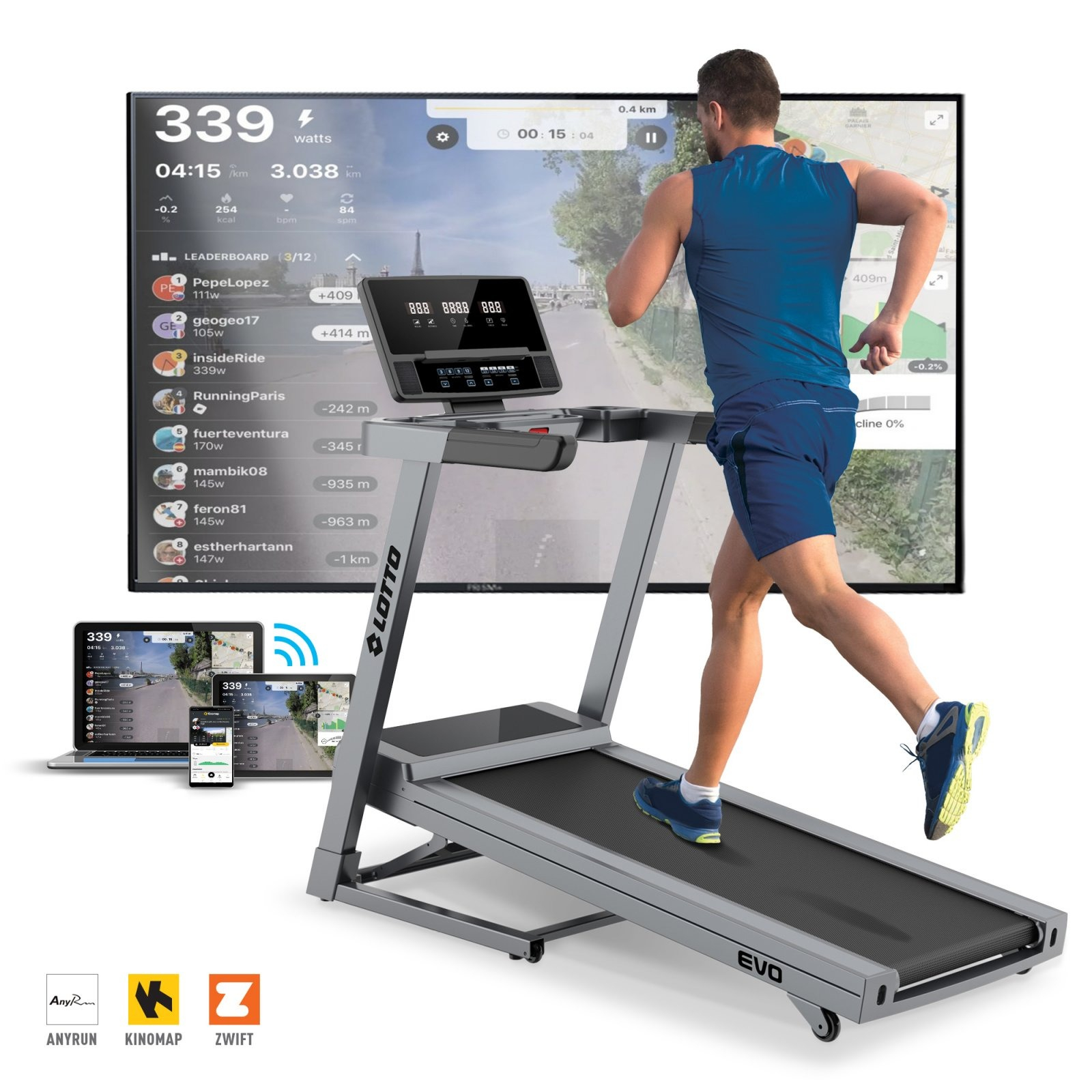| CONECTIVITATE | posibilitatea împerecherii calculatorului cu un smartphone sau tableta prin intermediul tehnologiei Bluetooth pentru controlul benzii prin intermediul aplicațiilor Kinomap/AnyRun/Zwift | ||