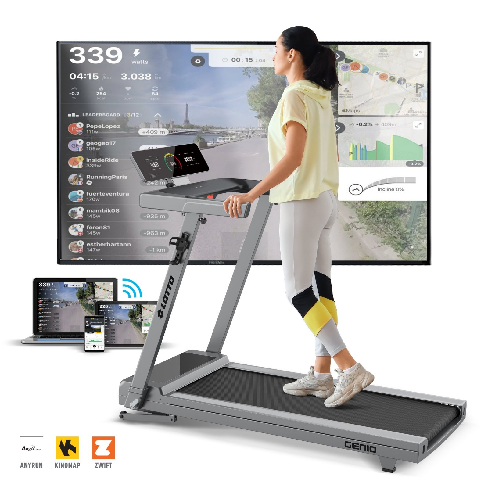 | CONECTIVITATE | posibilitatea împerecherii calculatorului cu un smartphone sau tableta prin intermediul tehnologiei Bluetooth pentru controlul benzii prin intermediul aplicațiilor Kinomap/AnyRun/Zwift | ||