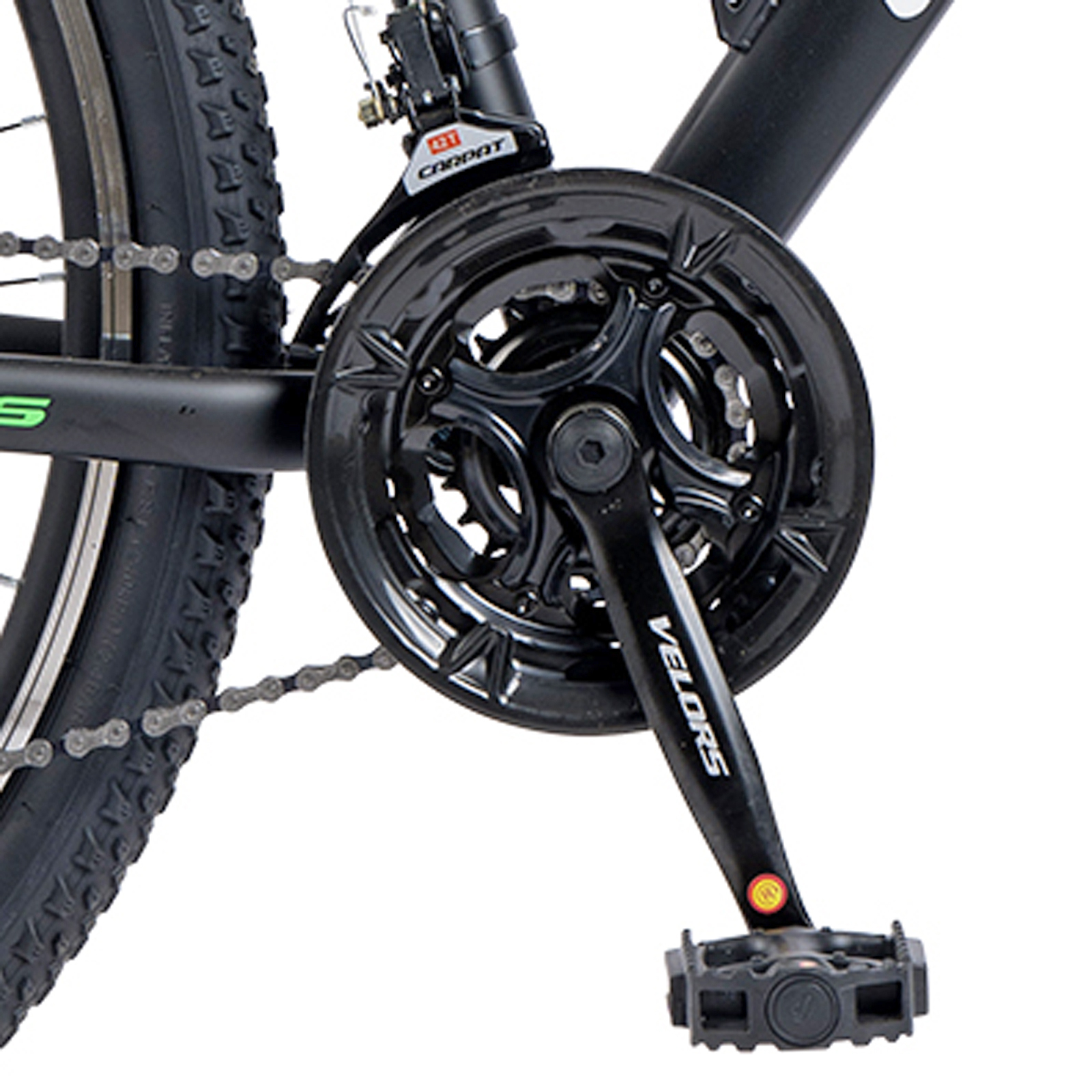 Bicicletele VELORS sunt produse in Romania, atat partea de concept si asamblarea fiind 100% romaneasca. Modelul VELORS Matador 2.9 prezentat aici este un full-suspension din gama entry level. Bicicleta dispune de un cadru din otel, geometria cadrului permitand utilizarea bicicletei atat de catre barbati cat si de catre femei. Confortul in utilizare este oferit de o furca dotata cu o suspensie de 100 mm, fara blocator si preload, de un ghidon cu o latime de 680 mm, un amortizor cadru cu o cursa de 75 mm si o geometrie a cadrului care ofera o pozitie comoda la pedalare. Sistemul de franare este disc mecanic, eficient in actionare indiferent de suprafata de rulare. Transmisia dispune de un schimbator fata CARPAT Line 3 viteze, un schimbator spate SHIMANO Tourney TZ-500 7 viteze, actionate de un set de manete secventiale CARPAT Line EasyFire 3x7 viteze. Jantele din aluminiu duble sunt echipate cu anvelope OUC YS 29"x2.125, profilul intermediar asigurand o aderenta buna atat pe asfalt cat si pe drumurile cu macadam. In concluzie, modelul VELORS Matador 2.9 este o bicicleta construita pentru plimbari recreative in parcuri, poteci de padure sau deplasari in oras, echiparea entry-level nerecomandand bicicleta pentru trasee de anduranta in regim de off-road. Bicicleta se livreaza asamblata 85%, necesitand montarea rotii fata, a ghidonului si a pedalelor. Pentru o functionare corecta si o utilizare in siguranta recomandam ca inainte de prima utilizare bicicletei sa i se faca o serie suplimentara de reglaje, in special transmisiei si sistemului de franare.