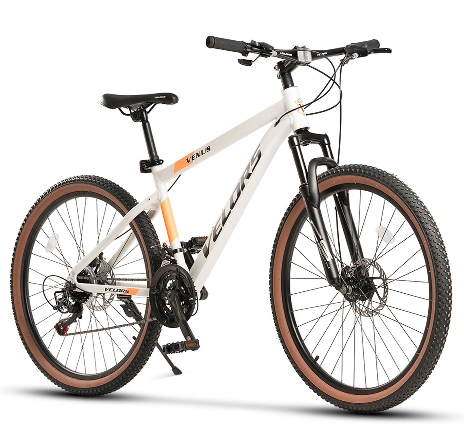 Bicicleta MTB-HT 26" VELORS Venus, cadru aluminiu 17", manete secventiale, frane disc, 21 viteze, alb/portocaliu