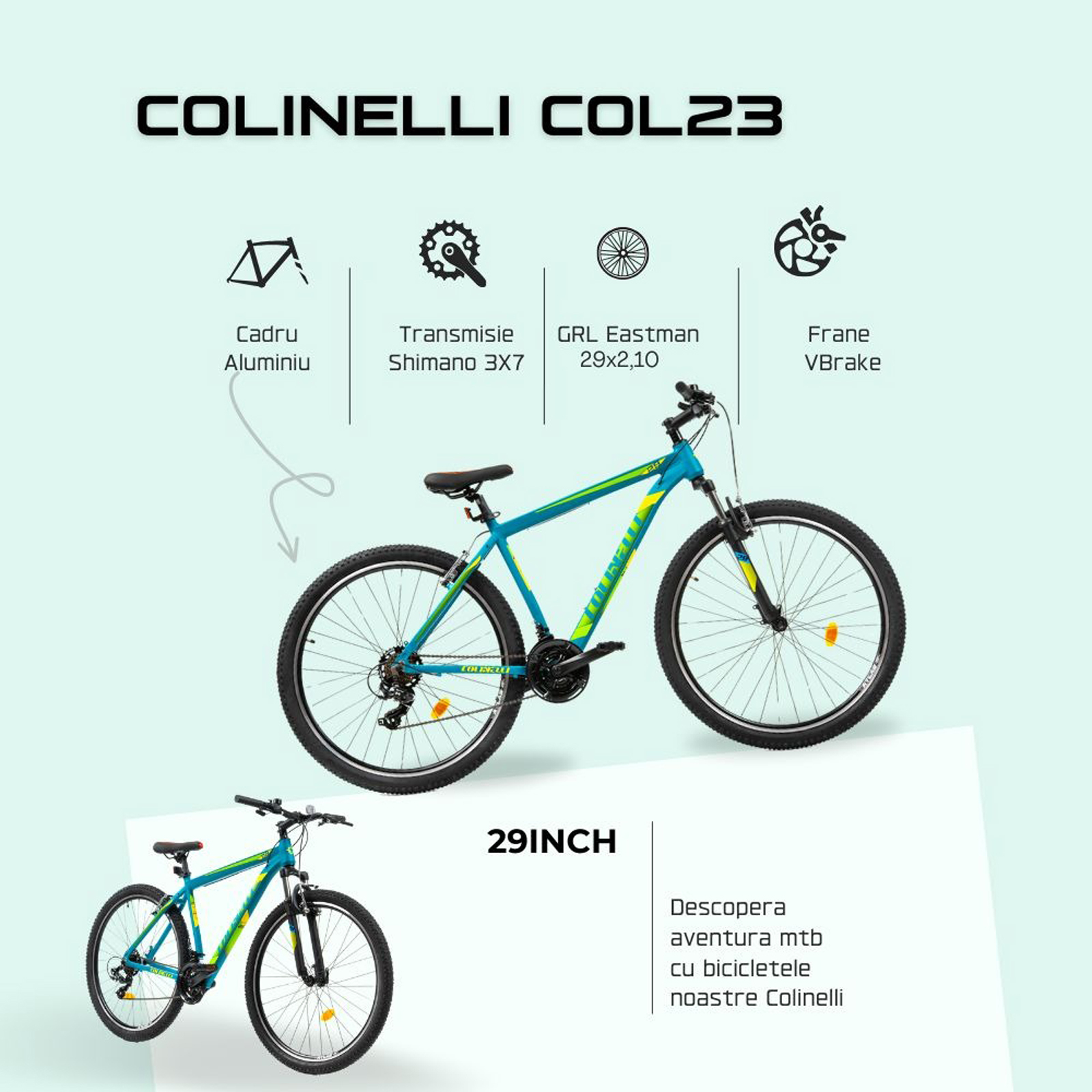 Bicicleta MTB-HT COLINELLI 2923, cadru aluminiu 18", manete secventiale, frane V-Brake, 21 viteze, turcoaz