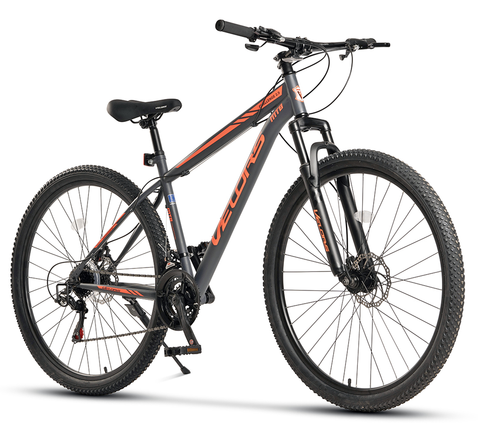 Bicicleta MTB-HT 29" VELORS Challenge 2.9, cadru otel 18", manete secventiale, frane disc, 21 viteze, gri/portocaliu