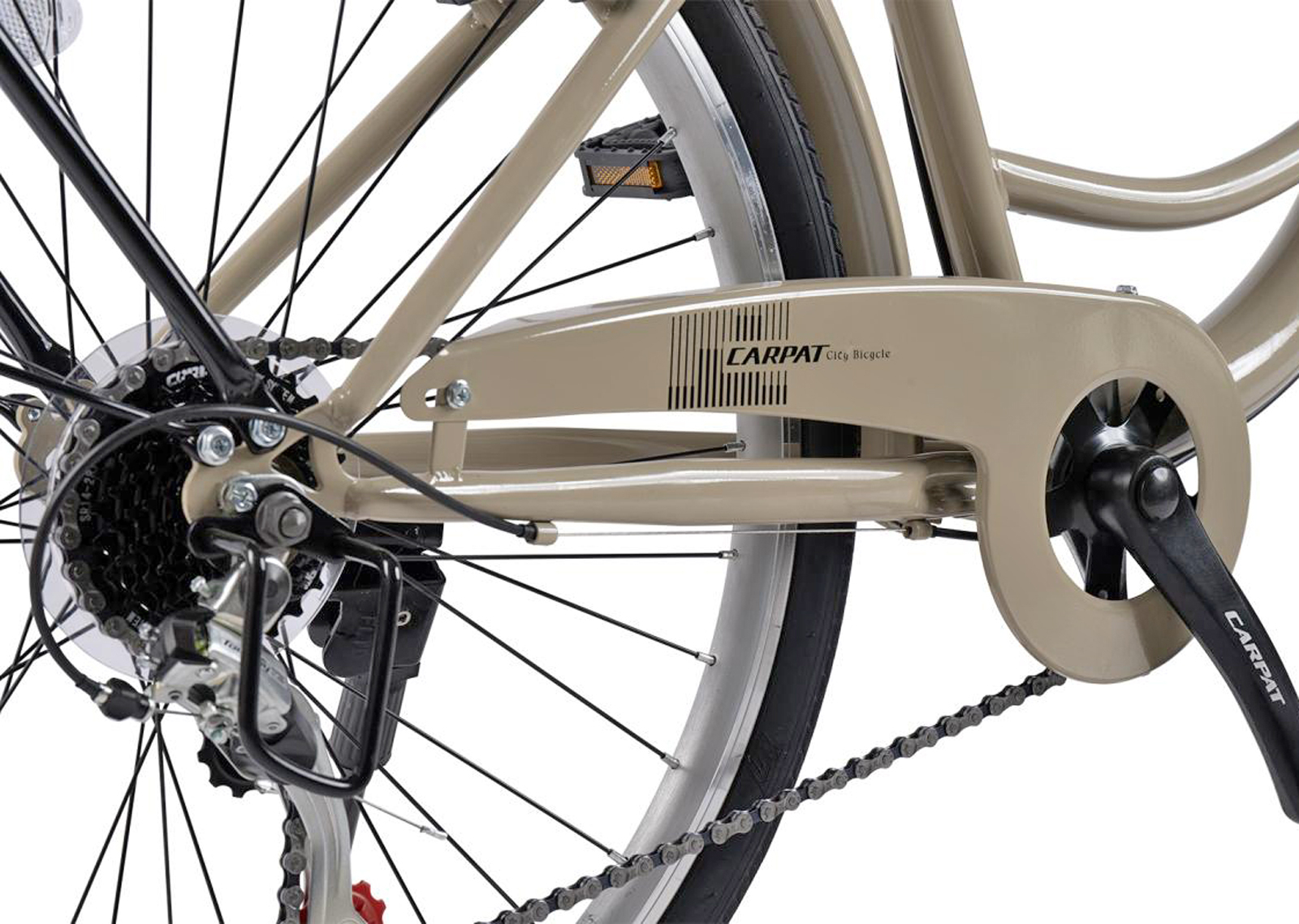 Bicicleta CARPAT City este o bicicleta clasica, construita pentru deplasari in oras sau plimbari relaxante in parcuri. Cadrul din otel are o geometrie dedicata utilizarii bicicletei de catre femei. Transmisia 1x7 viteze include un schimbator spate SHIMANO Tourney TZ 7 viteze actionat de un schimbator rotativ SHIMANO RV-200, cele 7 rapoarte fiind suficiente pentru abordarea cu succes a drumurilor in panta sau pentru gasirea unui raport optim de deplasare pe portiunile plane. Sistemul de franare este V-Brake, fiabil si usor de intretinut. Jantele duble din aluminiu sunt echipate cu anvelope al caror profil asigura o deplasare usoara si lina pe suprafetele asfaltate. Bicicleta dispune de un portbagaj robust si un cos incapator, transportul diferitelor obiecte nemaifiind o problema. Bicicleta se livreaza asamblata 85%, necesitand montarea rotii fata, a ghidonului si a pedalelor. Pentru o functionare corecta si o utilizare in siguranta recomandam ca inainte de prima utilizare bicicletei sa i se faca o serie suplimentara de reglaje, in special transmisiei si sistemului de franare.