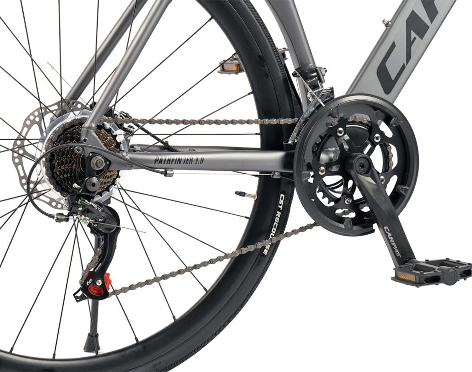 Bicicleta ciclocross CARPAT Pathfinder 3.0 este un entry-level dedicat utilizarii de catre cei care vor sa se initieze in parcurgerea traseelor de ciclocross sau a iesirilor in natura, pe trasee mixte. Dotata cu un cadru din aluminiu cu o geometrie ergonomica si sportiva, bicicleta poate fi utilizata atat de catre femei cat si de catre barbati. Transmisia este una entry-level, fiind compusa dintr-un schimbator fata MICRONEW 2 viteze, un schimbator spate SHIMANO Tourney TZ 7 viteze, actionate de un set de manete index SHIMANO Tourney TX-30 2x7 viteze. Franele sunt mecanice disc, decente in franare indiferent de suprafata de rulare. Rotile de 28" au jante din aluminiu duble, echipate cu un set de anvelope CST Recourss 700x42C cu profil de sosea. In concluzie, o bicicleta bine construita, cu o echipare entry-level din punct de vedere al performantelor, cu o functionalitate decenta, construita pentru o utilizare in scop recreational. Bicicleta se livreaza 85% asamblata, necesitand montarea rotii fata, a ghidonului si a pedalelor. Pentru o functionare corecta si o utilizare in siguranta recomandam ca inainte de prima utilizare bicicletei sa i se faca o serie suplimentara de reglaje, in special transmisiei si sistemului de franare.