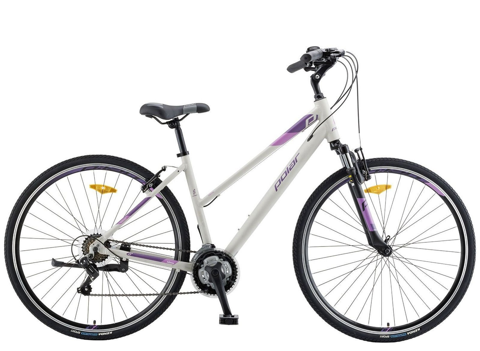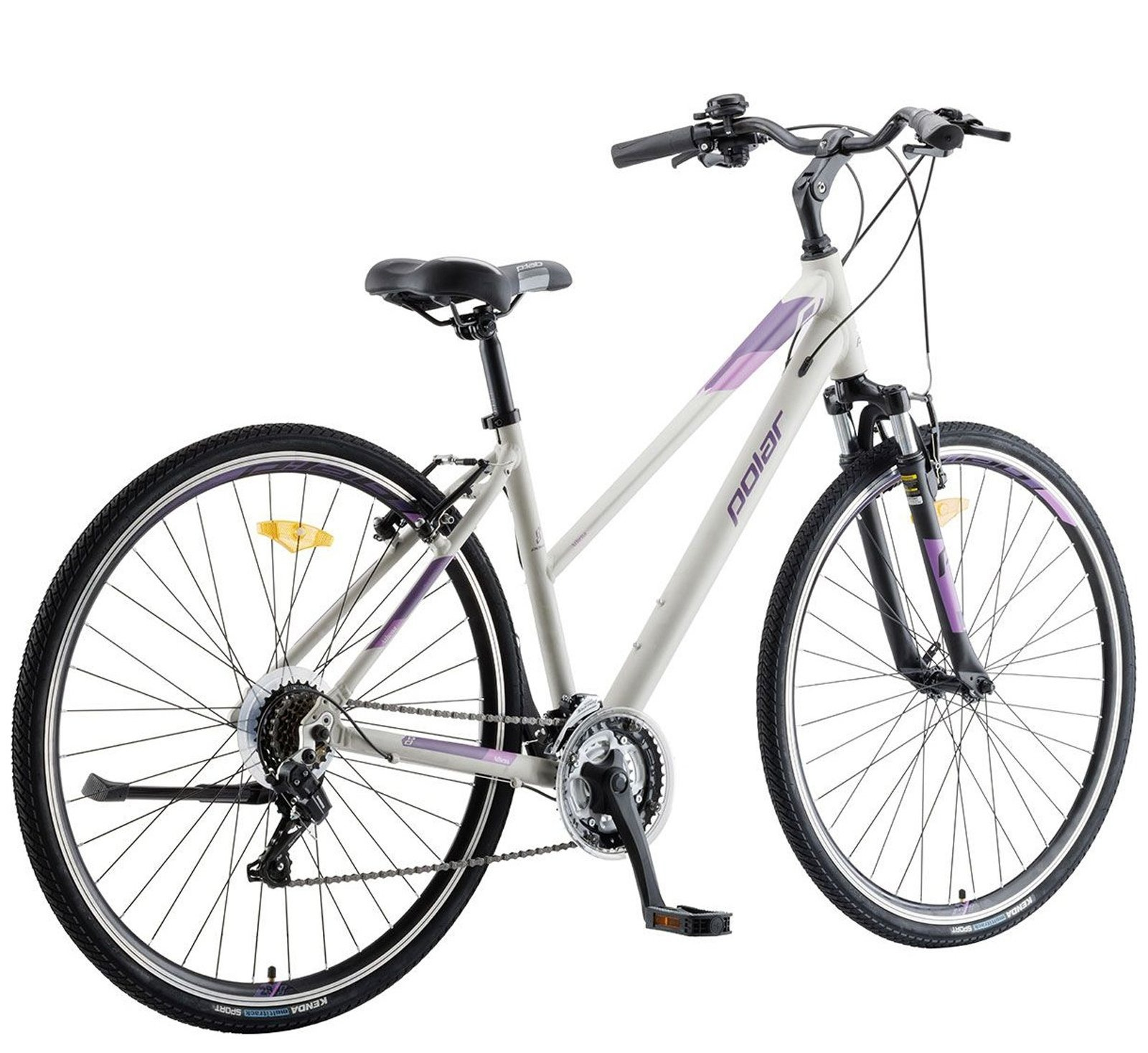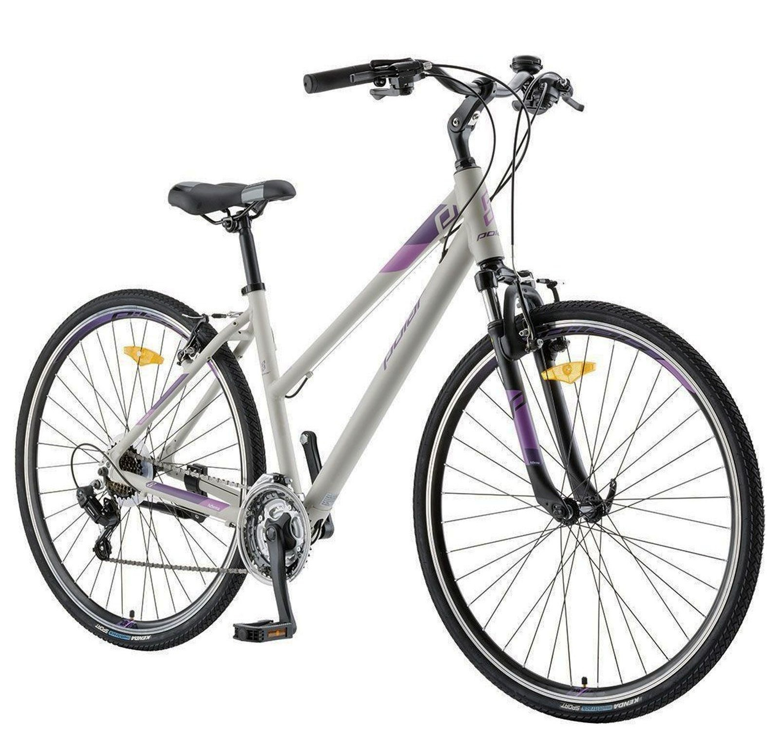 Bicicleta cross-fitness 28" POLAR Athena, cadru aluminiu 19.5", manete secventiale, frane V-Brake, 21 viteze, argintiu/mov