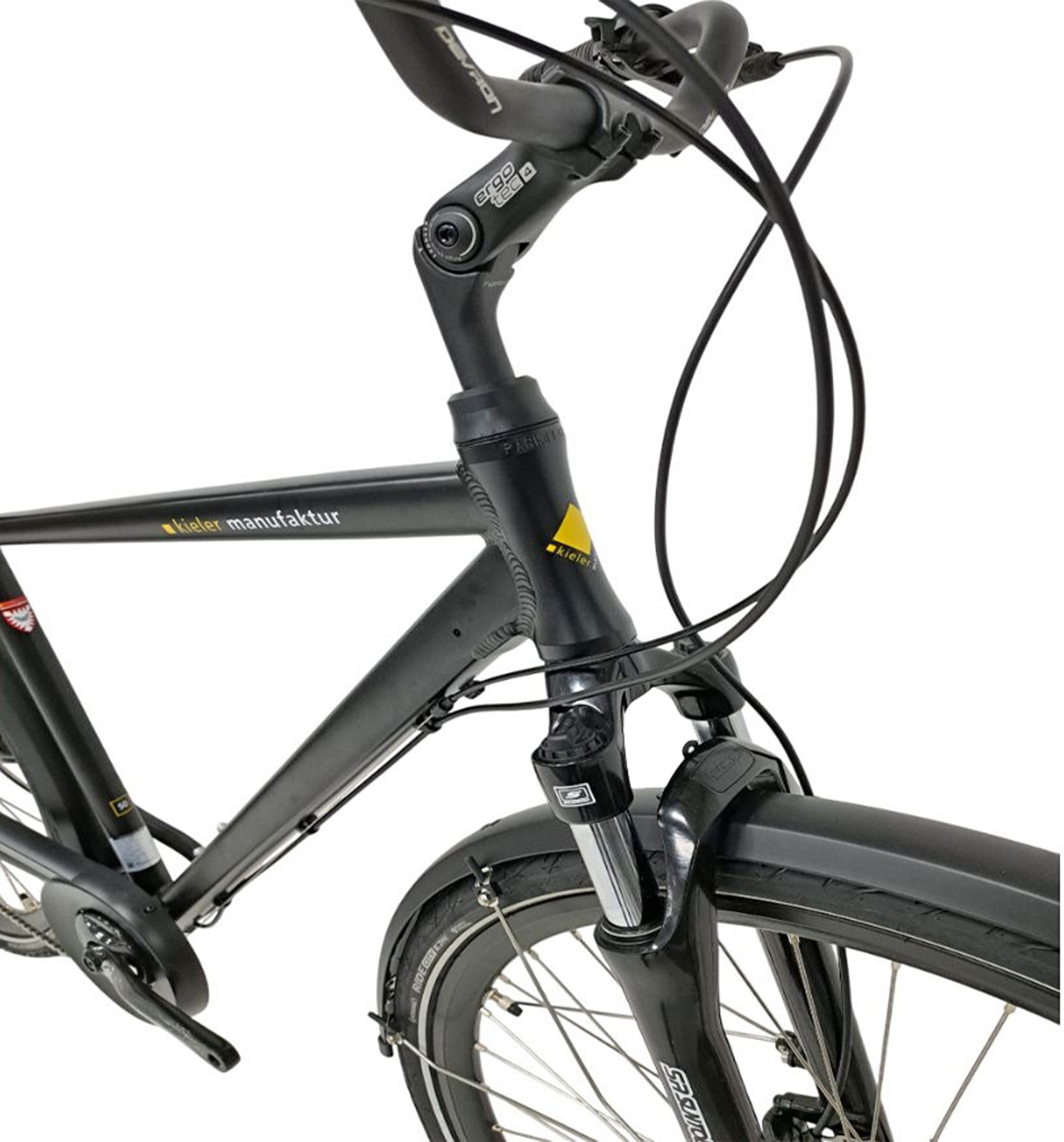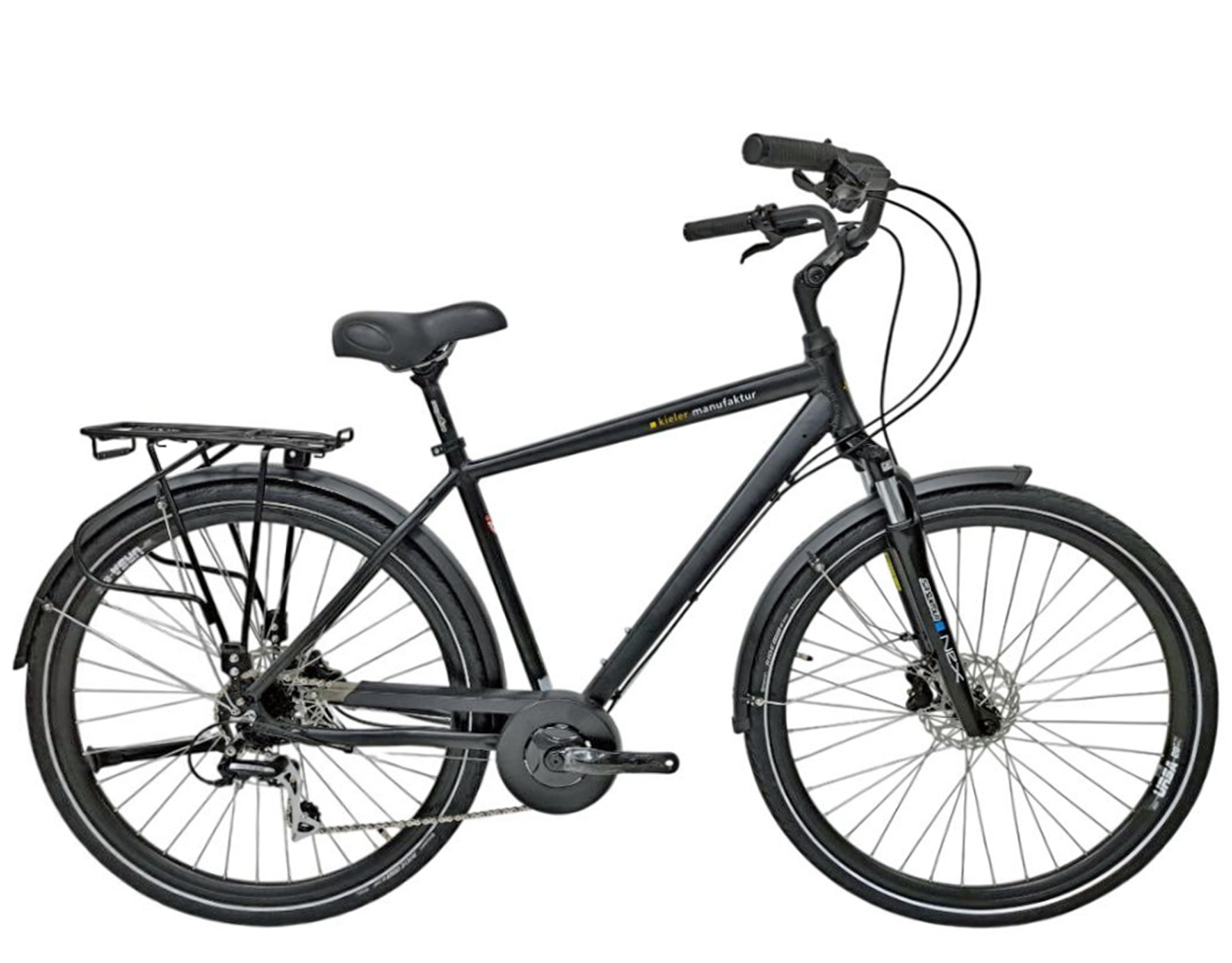 KREIDLER Kieler Man este o bicicleta de oras veritabila, putand fi utilizata cu succes atat pentru deplasarile zilnice in oras, cat si pentru plimbari relaxante. Bicicleta dispune de un cadru din aluminiu, robust si ergonomic, geometria cadrului fiind dedicata utilizarii bicicleteio de catre barbati. Transmisia bicicletei este asigurata de un schimbator spate SHIMANO Acera 8 viteze, actionat de o maneta secventiala SHIMANO Altus SL-M315 RapidFire 1x8 viteze. Sistemul de franare este disc hidraulic, eficient in franare indiferent de suprafata de rulare. Jantele duble din aluminiu 28"x32H sunt echipate cu anvelope CONTINENTAL Ride City E25 (42-622) cu dunga reflectorizanta si antipana, profilul acestora oferind o rulare optima pe orice tip de suprafata. Bicicleta are o multime de dotari, de remarcat fiind portbagajul solid cu elemente care permit montarea unor coburi laterali, folositori in deplasarile lungi, un sistem de iluminare LED cu baterii, o sa cu gel comoda, un set de aparatori de noroi care acopera eficient rotile si previne murdarirea in zilele ploioase si un cric reglabil. Confortul in deplasare este asigurat de o furca SR SUNTOUR SF16 NEX, cu o cursa a suspensiei de 50 mm, un ghidon ergonomic cu o latime de 640 mm si o sa lata cu gel, comoda in special pentru deplasarile lungi. In concluzie, daca ai nevoie de o bicicleta pentru deplasari rapide in oras, dar in acelasi timp esti amator de plimbari lungi in natura, KREIDLER Kieler Man merita atentia ta in cazul unei achizitii.
