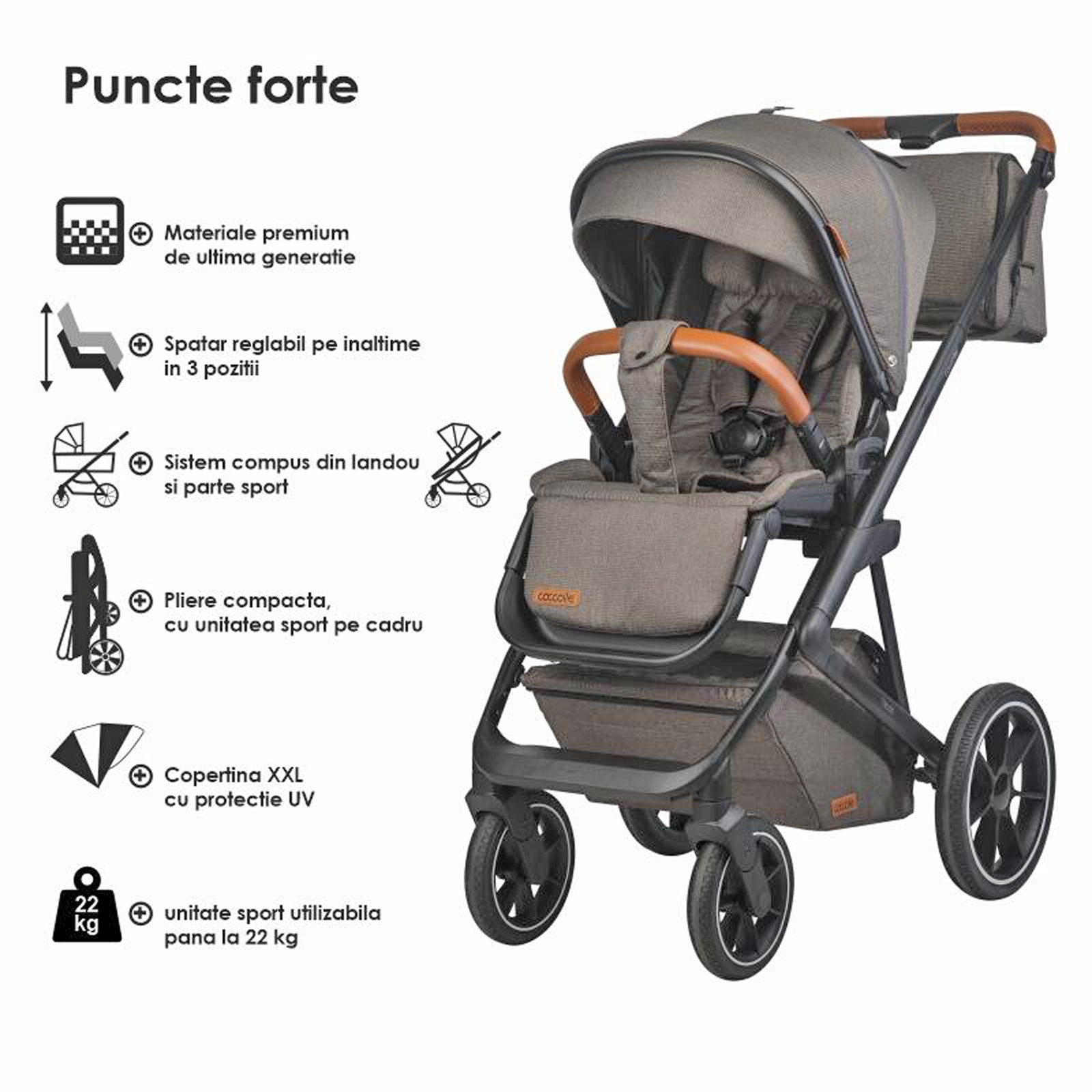 Cu ajutorul sistemului modular 2in1 Coccolle Nessia ai toate produsele si accesoriile pe care le vei folosi inca de la stadiul de nou-nascut: landou, unitate sport, husa de picioare, husa de insecte si de ploaie, gentuta pentru mamici cu dubla functie.