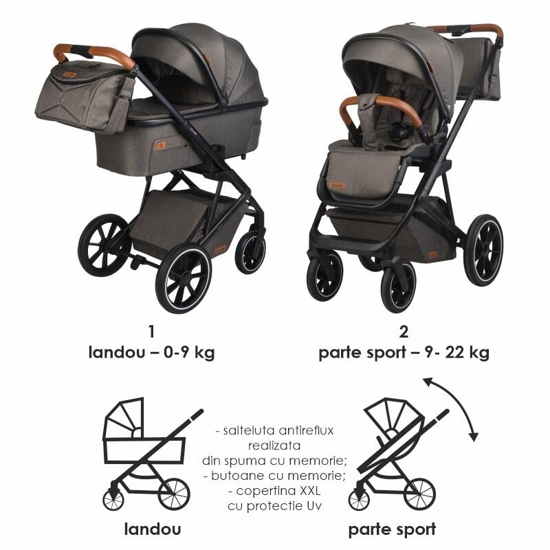 - Landou cu salteluta cu spuma de memorie si interior tratat anti-bacterian cu ioni de argint, copertina XXL cu fereastra de ventilatie