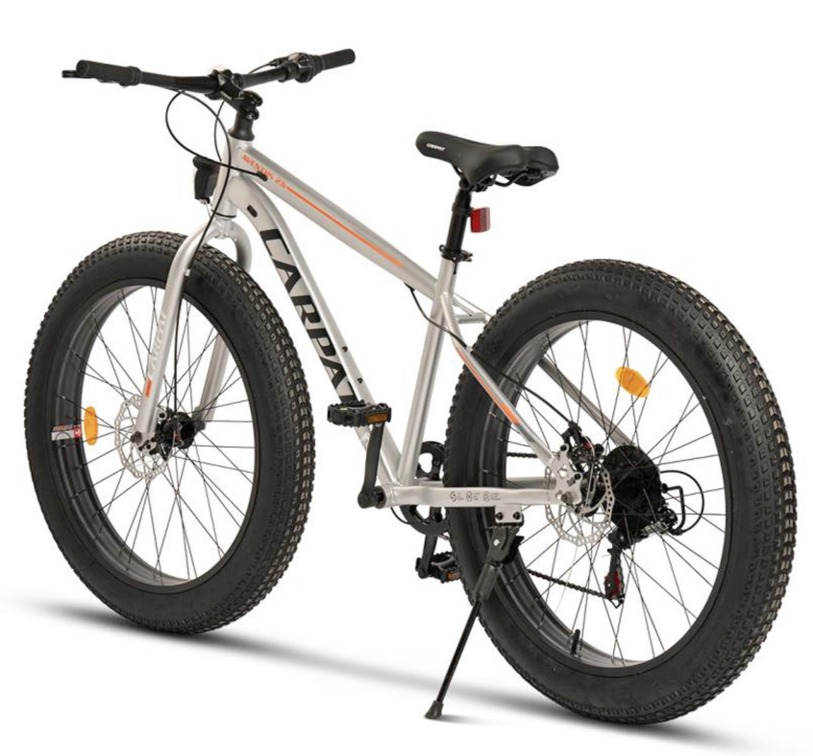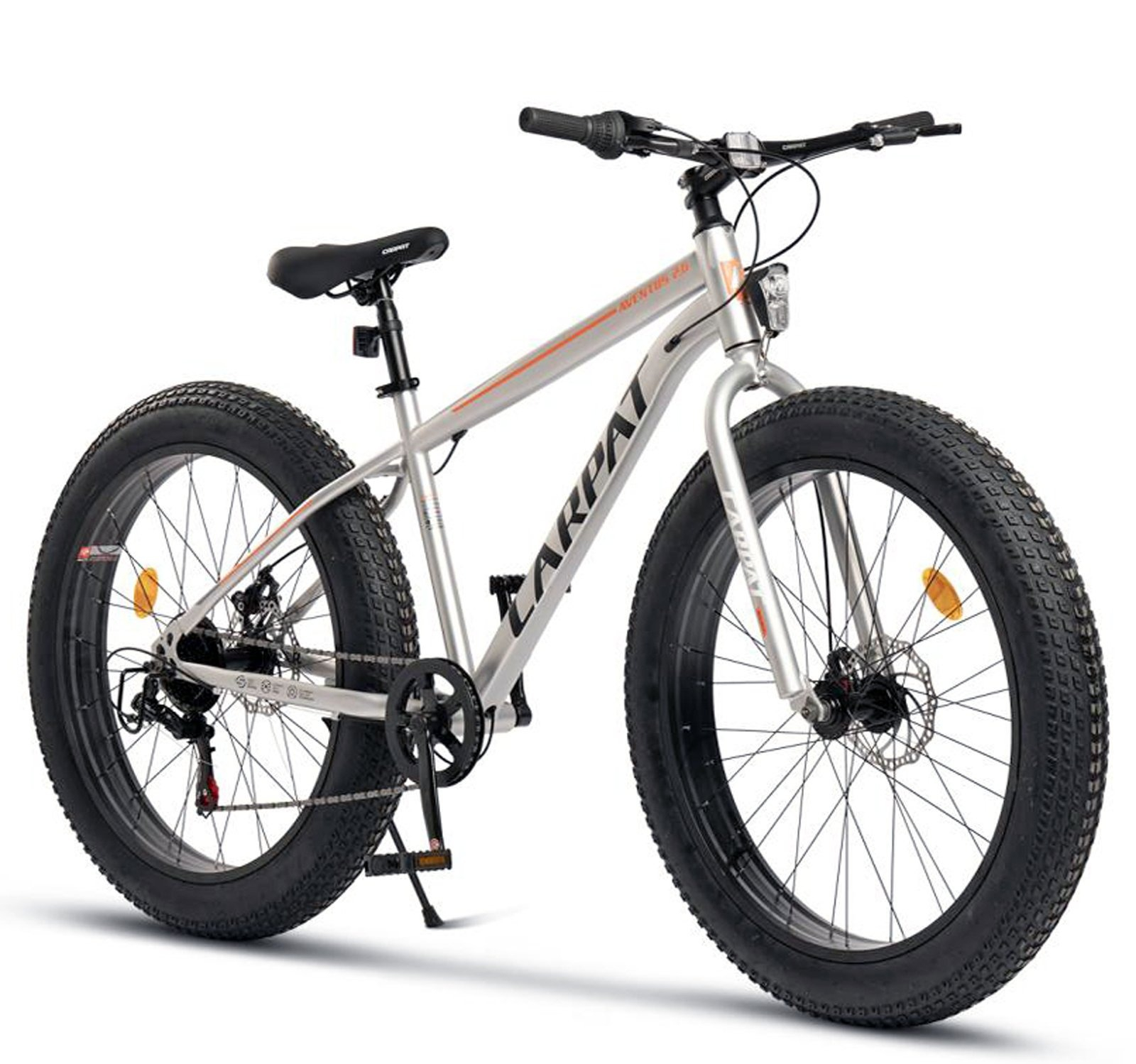Bicicleta Fat Bike 26" CARPAT Aventus 2.6, cadru otel 18", manete RevoShift, frane disc, 7 viteze, gri/portocaliu