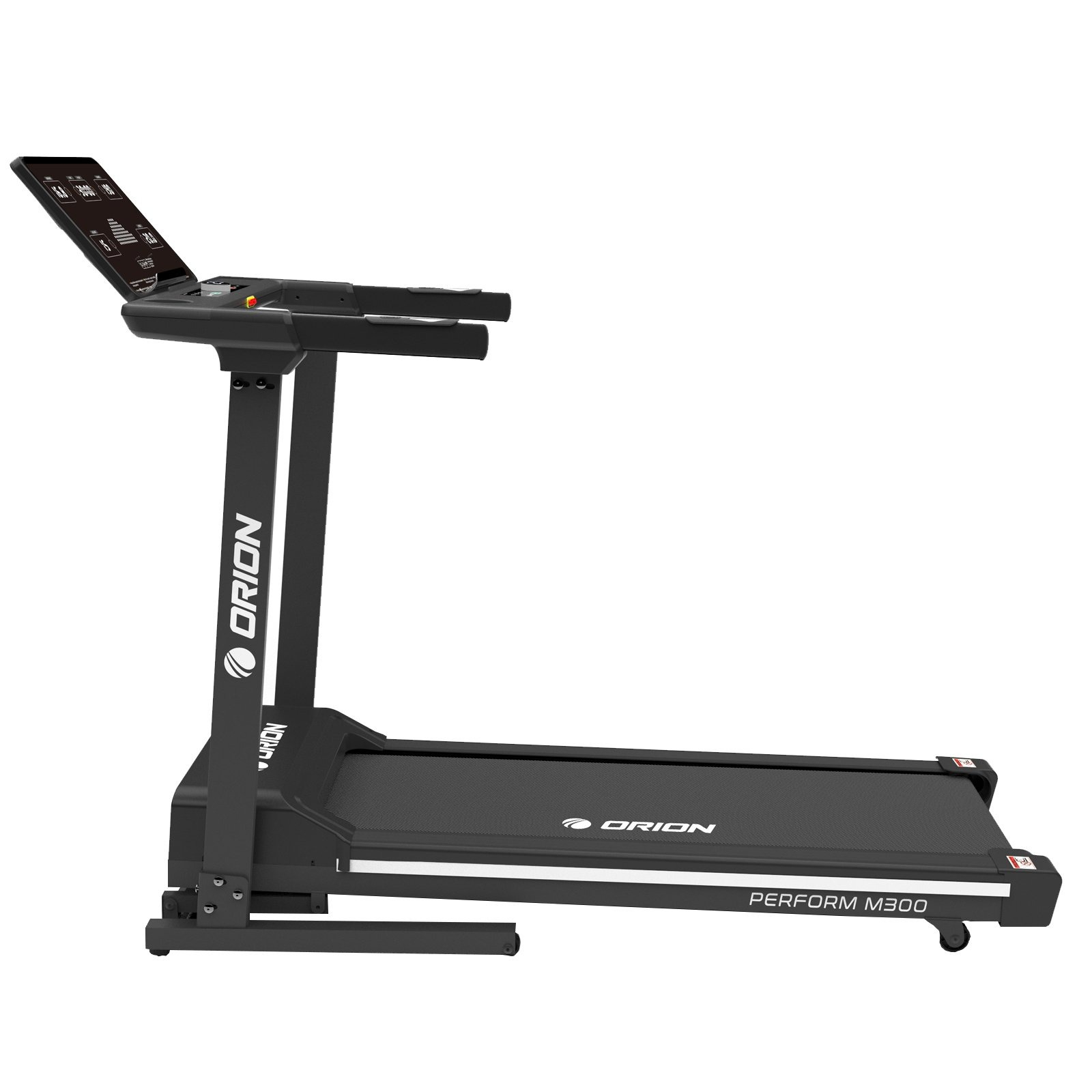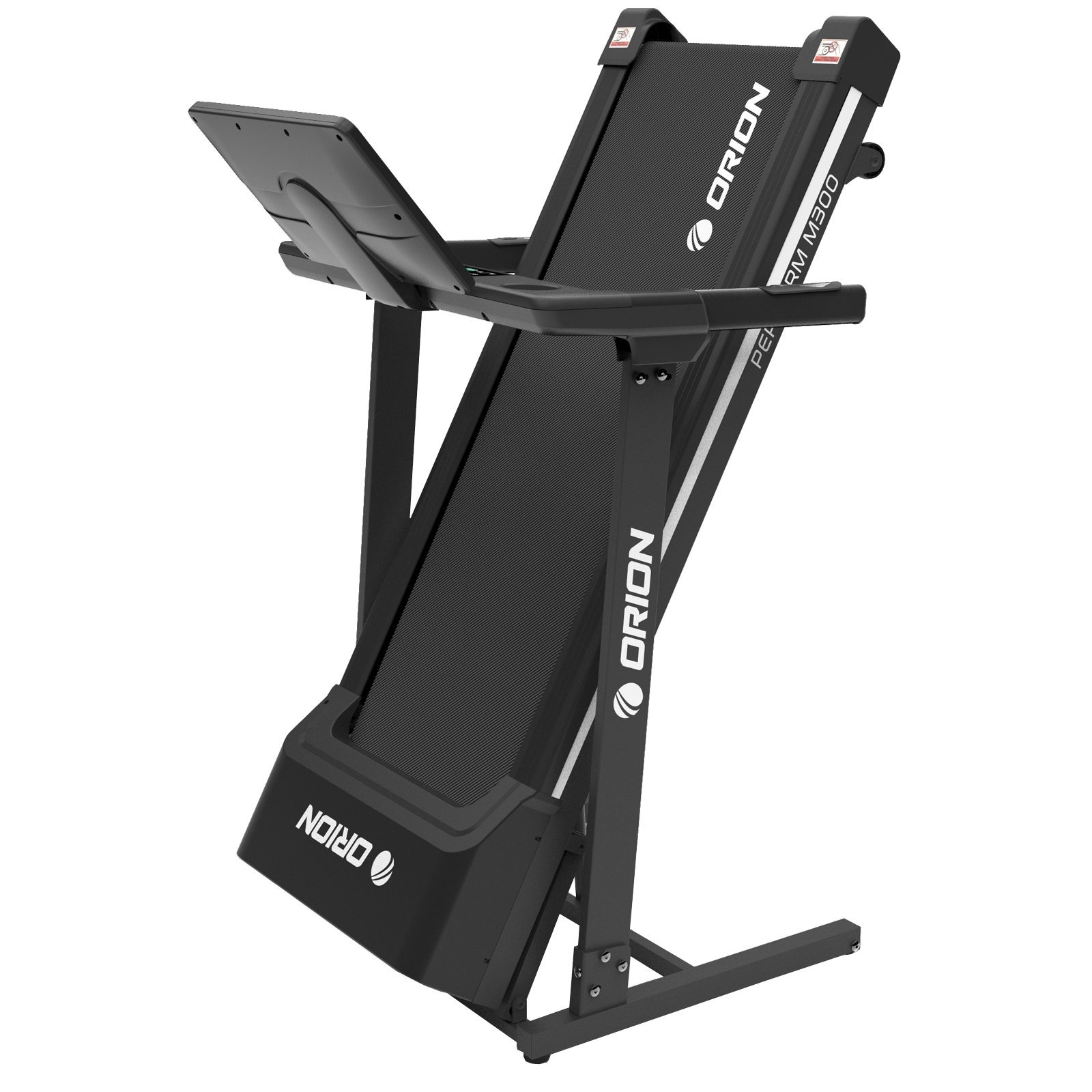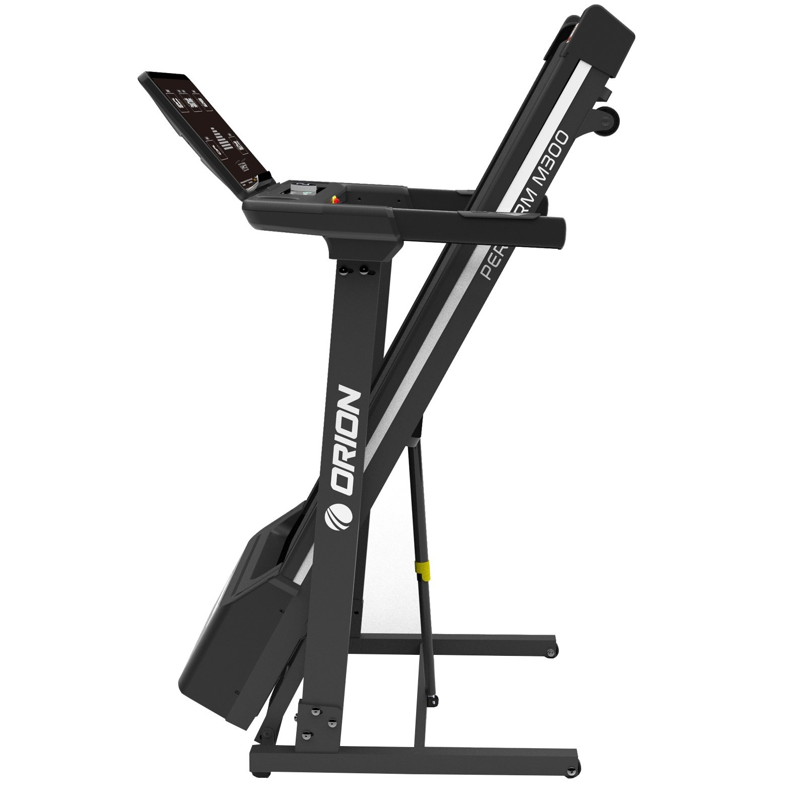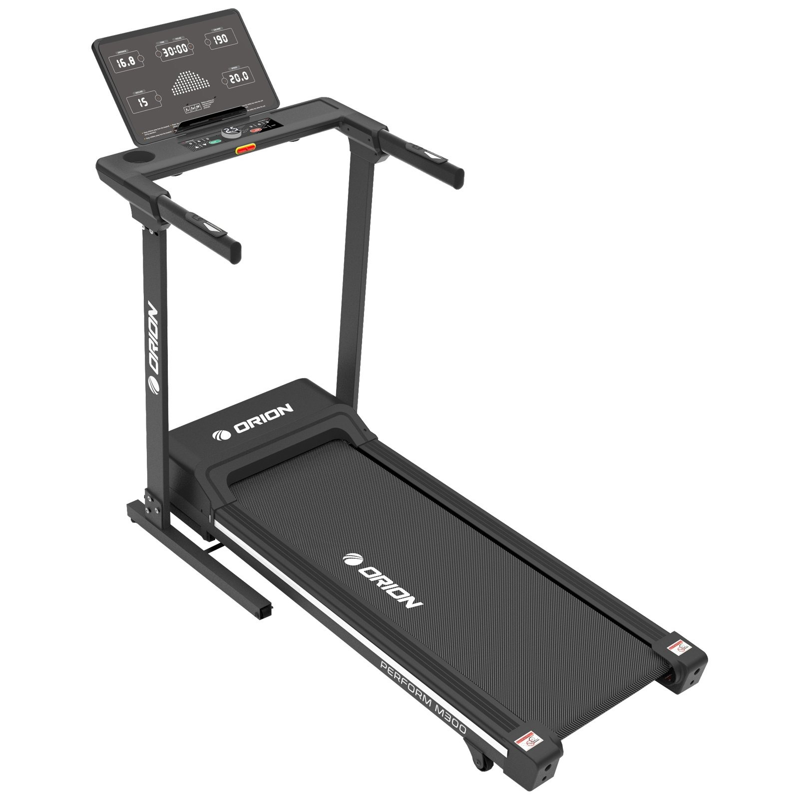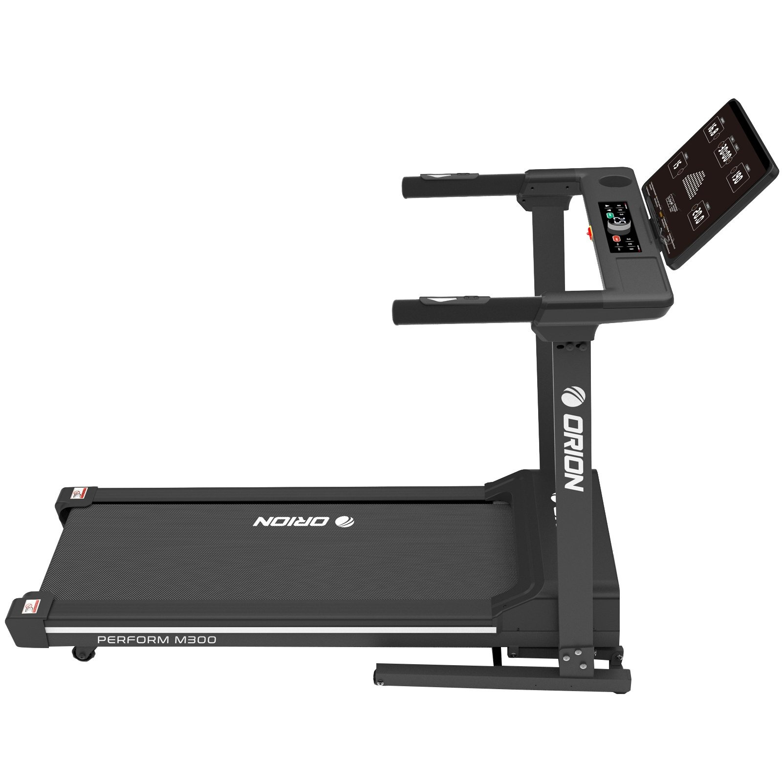 Calculatorul LED cu lumină albă afișează parametrii esențiali: viteză, timp, distanță, calorii, puls și înclinare. ORION Perform M300 dispune de 24 de programe presetate, 3 programe de utilizator și un program Body Fat pentru monitorizarea compoziției corporale. Tastele touch și comenzile rapide pentru viteză și înclinare fac utilizarea intuitivă și comodă.