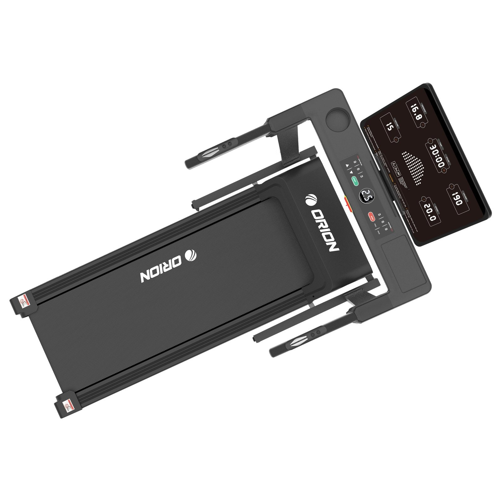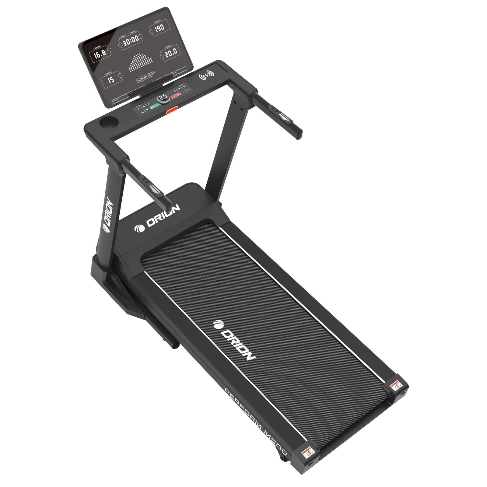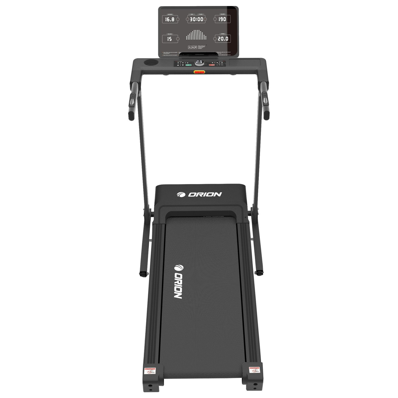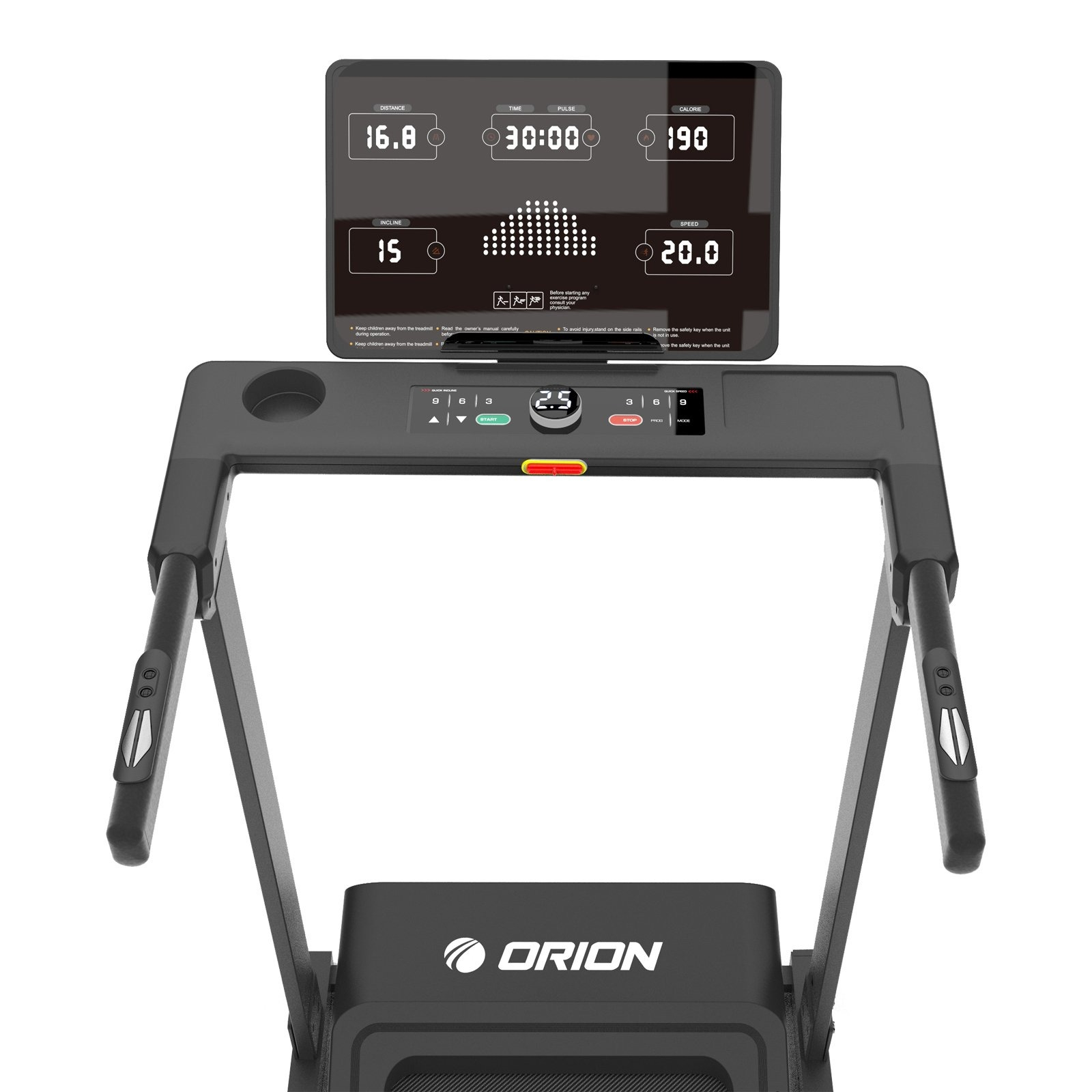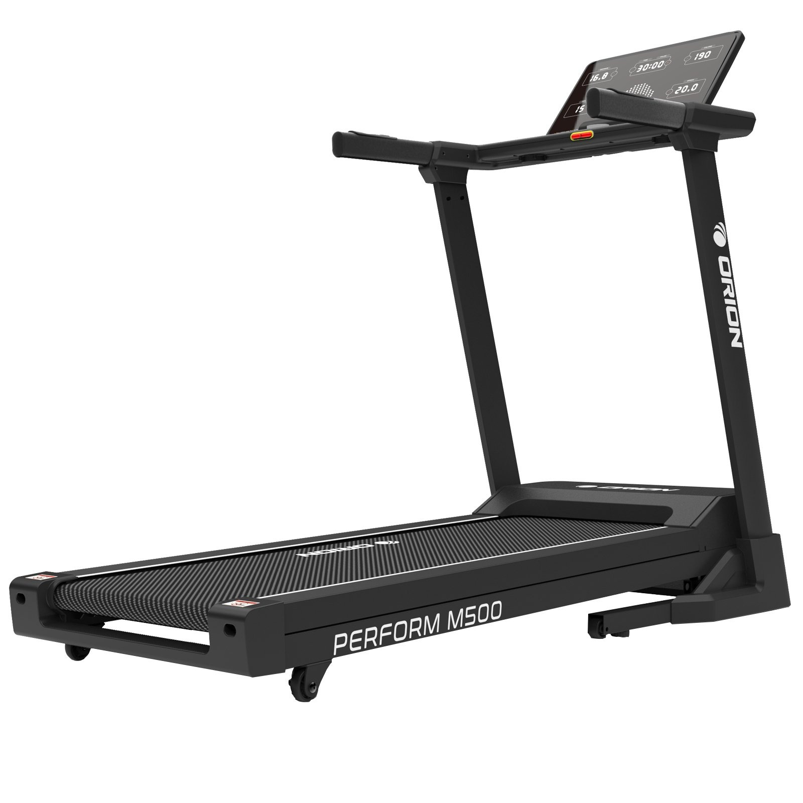 Calculatorul LED cu lumină albă afișează parametrii esențiali: viteză, timp, distanță, calorii, puls și înclinare. ORION Perform M300 dispune de 24 de programe presetate, 3 programe de utilizator și un program Body Fat pentru monitorizarea compoziției corporale. Tastele touch și comenzile rapide pentru viteză și înclinare fac utilizarea intuitivă și comodă.