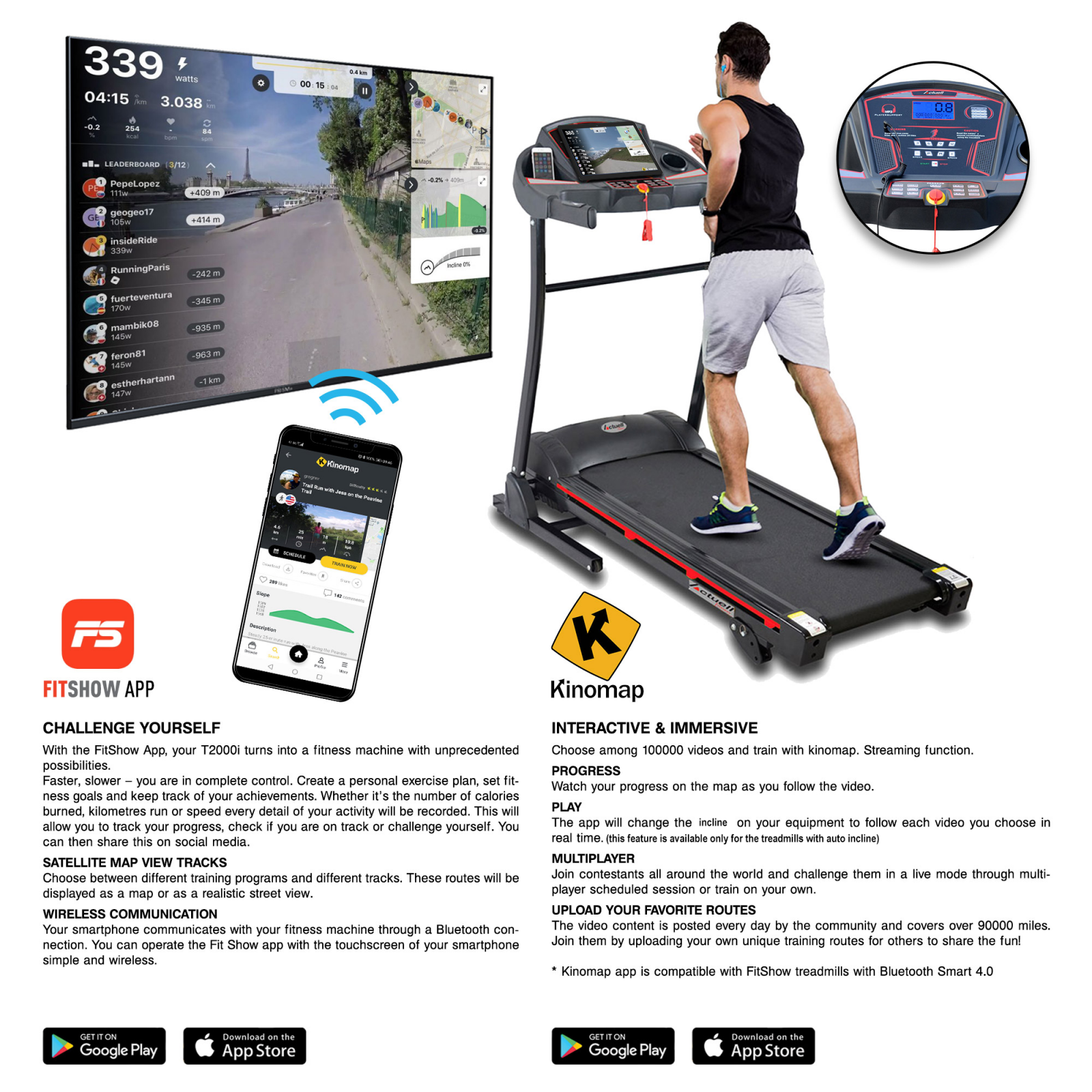 Prin conectarea benzii de alergat la aplicatia kinomap cu ajutorul tehnologiei Bluetooth veti beneficia de o multitudine de informatii si programe de antrenament, parteneri de antrenament si rute astfel incat nu va veti mai plictisi niciodata in timp ce folositi banda de alergat.
