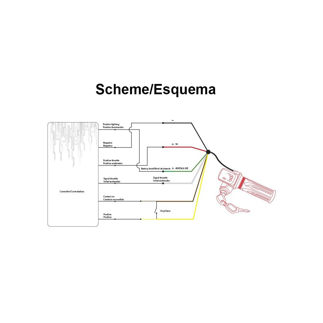 Manetă de accelerație generică cu tastă de contact, potrivită pentru 48V. Codul de culoare al conectorilor este următorul: Galben/Maro – buton apărător Verde – display pozitiv Negru – negativ comun Alb – ieșire accelerație Roșu – pozitiv accelerație (intrare continuă 5V) Indicator nivel de încărcare: 48V – 4 bare 45V – 3 bare 42,6V – 2 bare 5V până la 42,6V – 1 bar