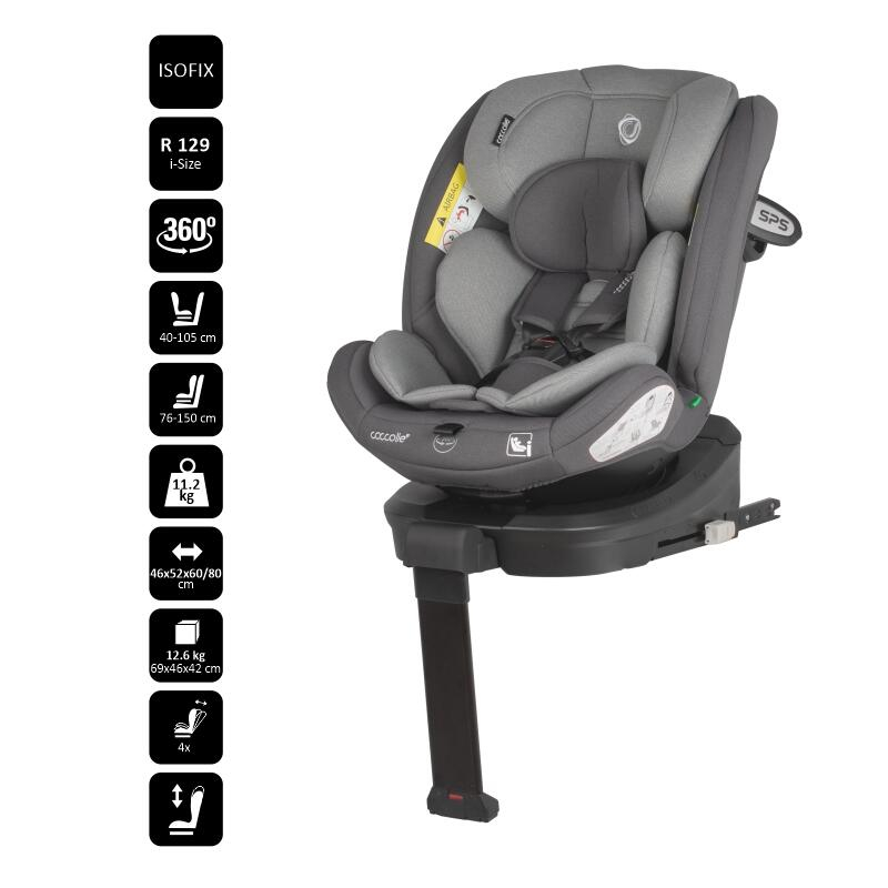 Certificat prin cel mai recent standard de siguranta R129, scaunul auto Coccolle Sidra este complet adaptabil inca de la stadiul de bebelus. Echipat cu un insert pentru nou nascuti ergonomic, materiale prietenoase si multiple niveluri de ajustare, acest scaun auto va face parte din familie mult timp. Ranforsarile interioare puternice sporesc siguranta conferita de scaun, in special rezistenta la impactul frontal si lateral.