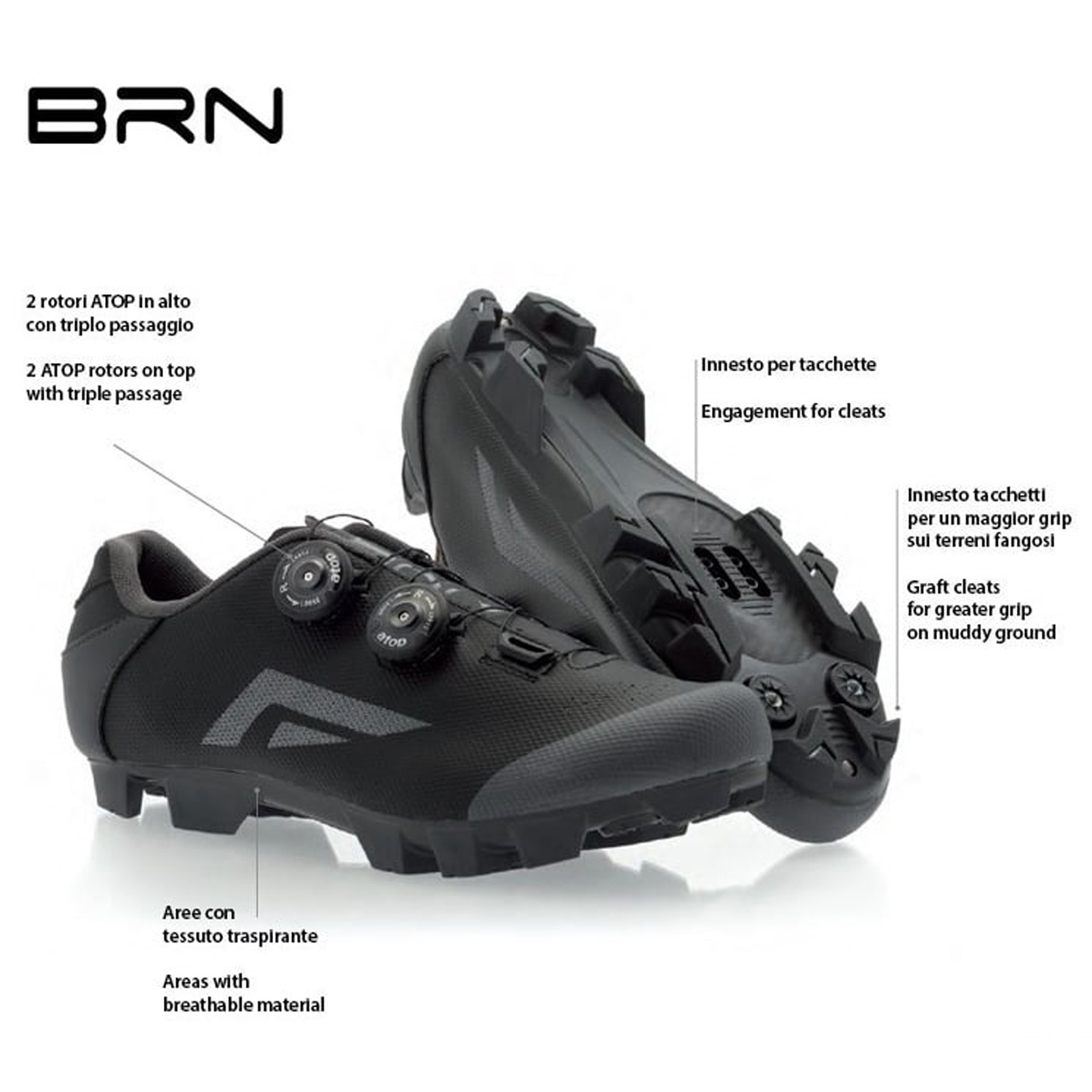Proiectat pentru ciclistul de off-road, noul pantof BRN Gladiator XC MTB este echipat cu talpi cu gauri pentru respirarea piciorului, gauri pentru pedale rapide si zone laterale cu tesatura respirabila pentru a mentine piciorul uscat si protejat de transpiratie pe durata pedalarii.