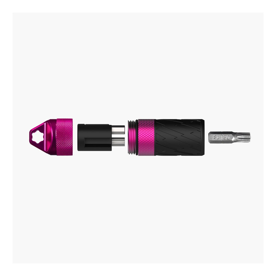 Unealta pentru ungerea lanturilor de pe bicicletele electrice. La e-bike bratul angrenajului se invarte independent de foaie, facand astfel ungerea lantului destul de dificila atunci cand nu ai un stand la dispozitie. Aceasta unealta se fixeaza in surburile foii, devenind astfel o piedica pentru bratul pedalier, angrenand toata transmisia, ca la o bicicleta non-electrica. Dimensiune: 69 x 23 x 23 mm fara curea Contine magnet Neodim Corp din Aluminiu 6061 cu capac Suport de biti din PP ce contine: 5mm, 6mm Hex & T30 Torx Manson de silicon ce protejeaza bratul de zgarieturi Potrivit pentru ungerea sau curatarea transmisiei Finisare roz anodizat Aceasta uneala nu este compatibila cu angrenajele fara spider!
