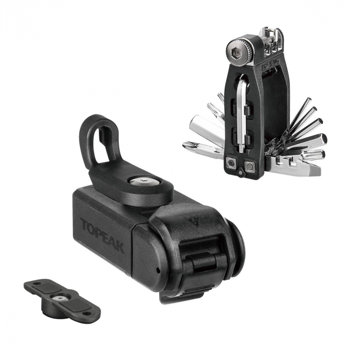 Se monteaza sub suportul pentru sticle de apa Ninja sau se foloseste singur cu suportul pentru cadru. Aceasta cutie de scule rezistenta la intemperii contine o mini unealta cu 18 functii pentru reparatii si intretinere de baza. (Instrumentul pentru lant este compatibil cu lanturi cu o singura viteza pana la 12 viteze, NU includ lanturile cu stift tubular Campagnolo)