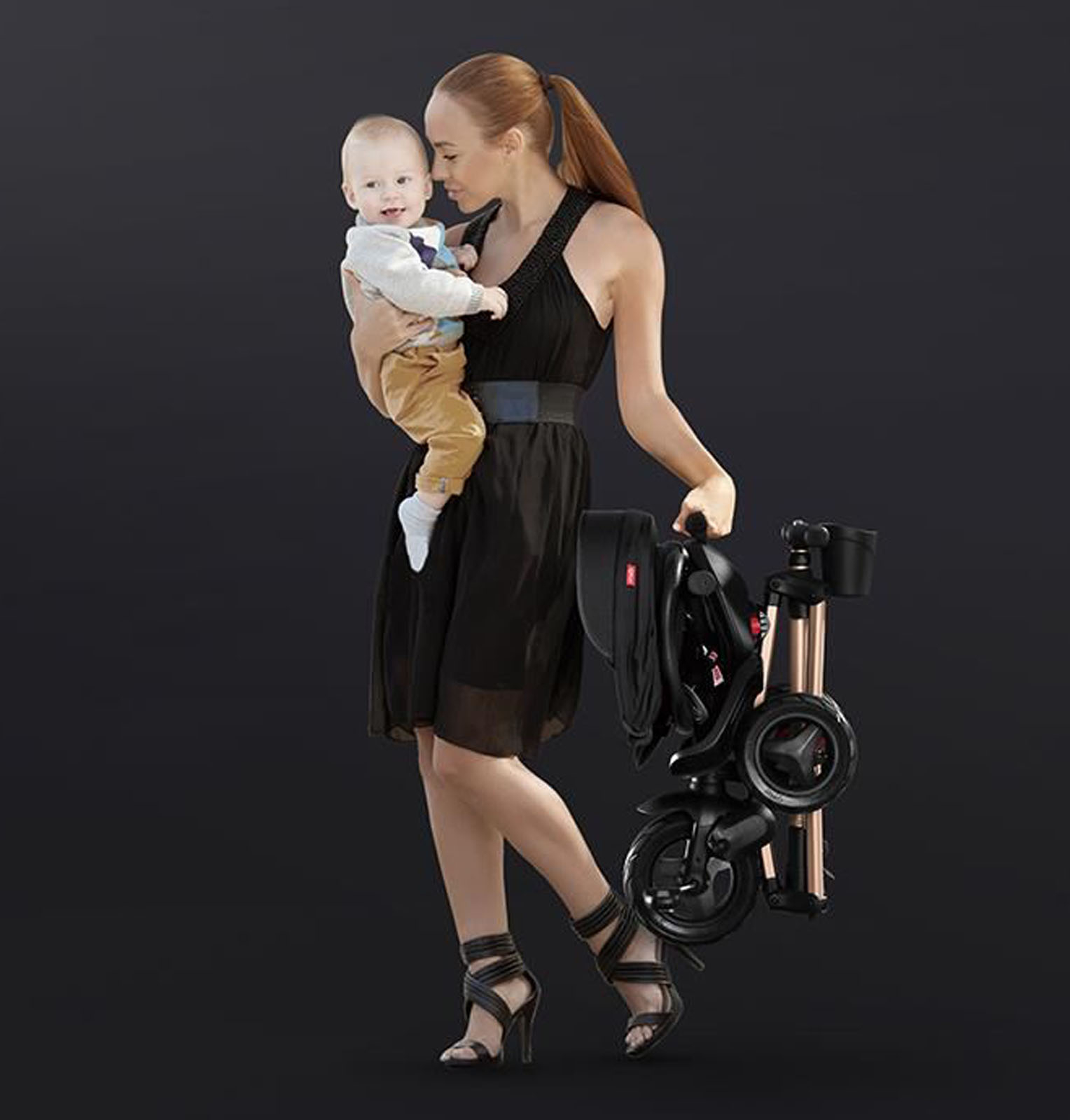 Dupa cum v-a obisnuit, si varianta Gold a tricicletei Qplay Nova se pliaza facil si rapid in cel mai compact mod, facand fata cu brio rigorilor unui spatiu de depozitare limitat sau unui portbagaj mic. Sezutul se roteste 360 grade, lasandu-va libertatea de a alege directia in care doriti sa va plimbati copilul. Multumita spatarului ajustabil, tricicleta ofera un anumit grad de inclinatie ideal pentru un mic pui de somn in timpul deplasarilor.