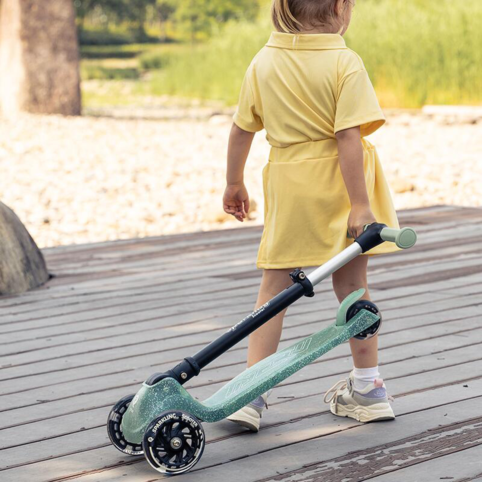 Trotinetă cu 3 roți QPlay Sparkling – roți cu lumini LED, platformă cu sclipici, pliere rapidă (de la 3 ani)